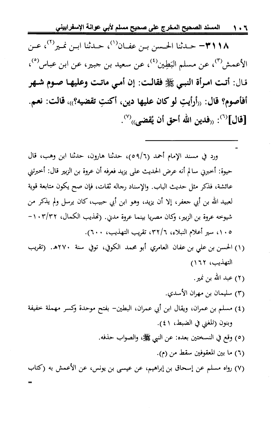 3118 - حدثنا الحسن بن عفان (¬1)، حدثنا ابن نمير (¬2)، عن الأعمش (¬3)، عن مسلم البَطِين (¬4)، عن سعيد بن جبير، عن ابن عباس (¬5)، قال: أتت امرأة النبي -صلى الله عليه وسلم- فقالت: إن أمي ماتت وعليها صوم شهر أفأصوم؟ قال: "أرأيتِ لو كان عليها دين، أكنتِ تقضيه؟ "، قالت: نعم. [قال] (¬6): "فدين الله أحق أن يُقضى" (¬7).