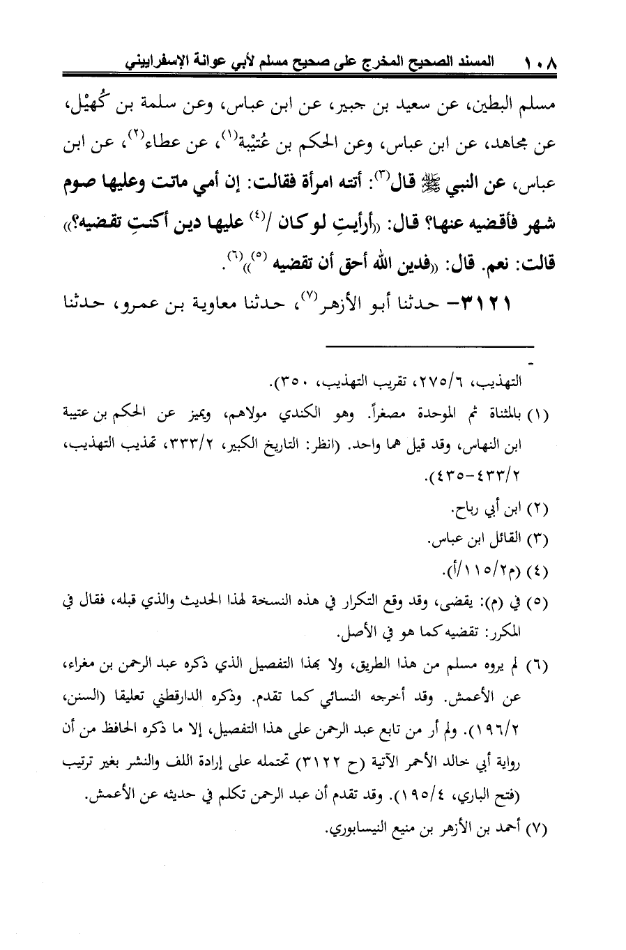 -[109]- زائدة (¬2)، عن الأعمش، عن مسلم البطين، عن سعيد بن جبير، عن ابن عباس، قال: جاء رجل إلى النبي -صلى الله عليه وسلم- فقال: يا رسول الله! إن أمي ماتت وعليها صوم شهر، أفأقضيه عنها؟ قال: "لو كان على أمك دين أكنتَ قاضيه عنها؟ "، [قال: نعم (¬3)] قال: "فدين الله أحق أن يقضى".