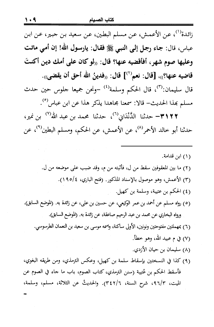 (¬4) كذا في النسختين بإسقاط سلمة بن كهيل، وعكس الترمذي، ومن طريقه البغوي، فأسقط الحكم بن عُتيبة (سنن الترمذي، كتاب الصوم، باب ما جاء في الصوم عن الميت، 3/ 96، شرح السنة، 6/ 342). والحديثُ عن الثلاثة، مسلم، وسلمة، =