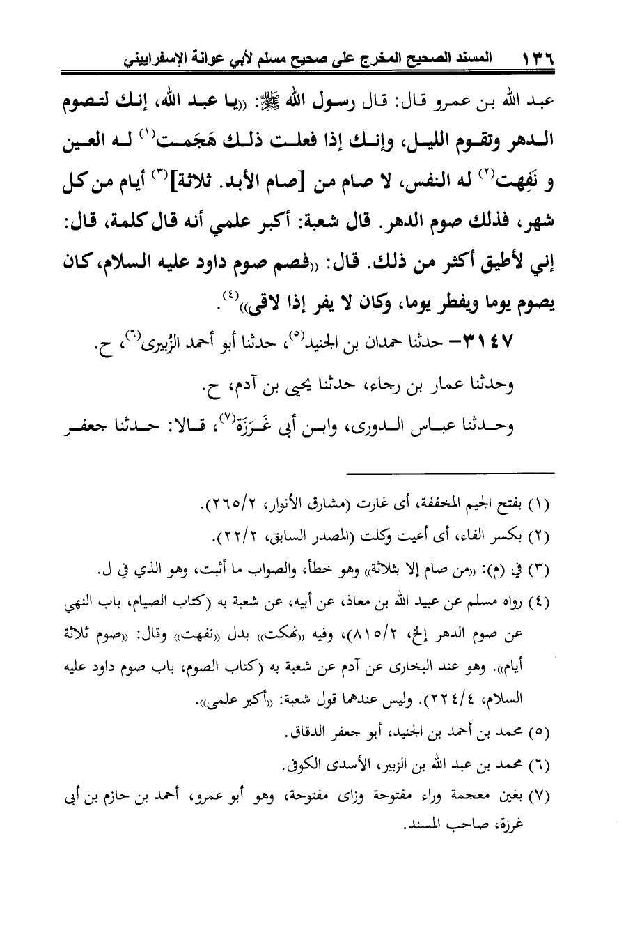 (¬7) أخرجه مسلم عن أبي كريب، عن محمد بن بشر العبدي، عن مسعر به، ولم يذكر لفظه، غير أنه أشار إلى أنه قال: "ونفهت النفس" (كتاب الصيام، باب النهي عن صوم الدهر إلخ، 2/ 816). وهو عند البخاري عن خلاد بن يحيى به (كتاب أحاديث الأنبياء، باب قوله تعالى: {وَآتَيْنَا دَاوُودَ زَبُورًا} (سورة النساء، الآية 162)، 6/ 454).