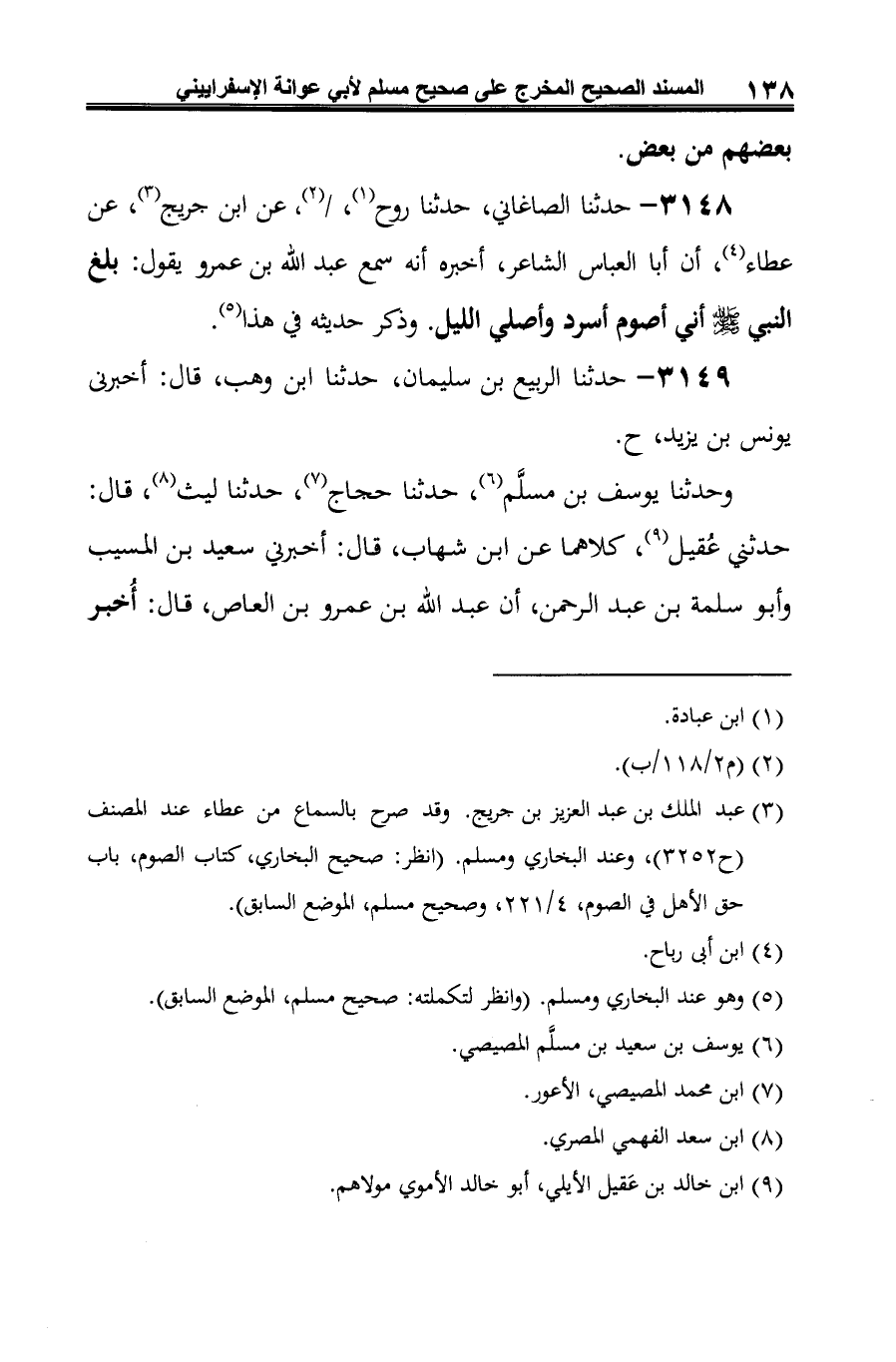 (¬7) هو موصول بالإسناد الأول كما في صحيح مسلم (كتاب الصيام، باب النهي عن صوم الدهر إلخ، 2/ 812). وإنما ذكر أبو عوانة هذا ليميز بين رواية يونس، ورواية عقيل التي ذكرها بالإسناد الثاني، وهي ليست عند مسلم. وهذه الزيادة، وإن كان يونس انفرد بذكرها من بين أصحاب الزهري، حسب ما وقفت عليه، إلا أنها ثابتة من رواية مجاهد وغيره عن عبد الله بن عمرو. (انظر: صحيح البخاري مع فتح الباري، كتاب فضائل القرآن، باب في كم يقرأ القرأن، 9/ 94، وكتاب الصوم، باب حق الجسم في الصوم، 4/ 217، وصحيح مسلم، كتاب الصيام، باب النهي عن صوم الدهر إلخ، 2/ 813 - 814).