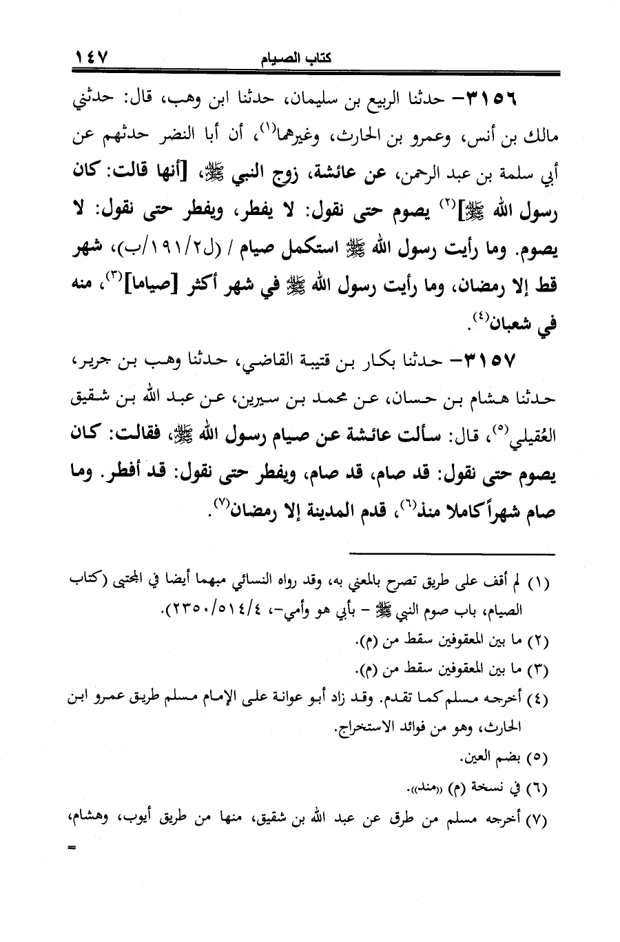 3157 - حدثنا بكار بن قتيبة القاضي، حدثنا وهب بن جرير، حدثنا هشام بن حسان، عن محمد بن سيرين، عن عبد الله بن شقيق العُقيلي (¬1)، قال: سألت عائشة عن صيام رسول الله -صلى الله عليه وسلم-، فقالت: كان يصوم حتى نقول: قد صام، قد صام، ويفطر حتى نقول: قد أفطر. وما صام شهرًا كاملا منذ (¬2)، قدم المدينة إلا رمضان (¬3).