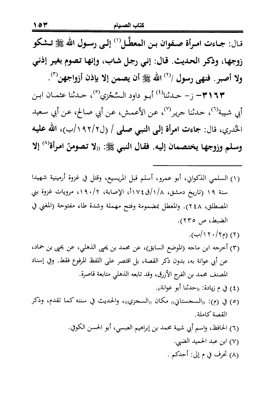 3163 - ز- حدثنا (¬1) أبو داود السِّجْزي (¬2)، حدثنا عثمان ابن أبي شيبة (¬3)، حدثنا جرير (¬4)، عن الأعمش، عن أبي صالح، عن أبي سعيد الخُدري، قال: جاءت امرأة إلى النبي صلى الله عليه وسلم وزوجها يختصمان إليه. فقال النبي -صلى الله عليه وسلم-: "لا تصومنّ امرأة (¬5) إلا
