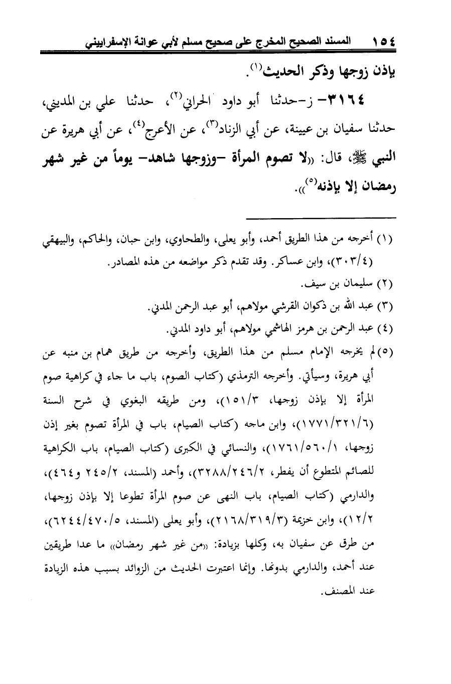 3164 - ز- حدثنا أبو داود الحراني (¬1)، حدثنا علي بن المديني، حدثنا سفيان بن عيينة، عن أبي الزناد (¬2)، عن الأعرج (¬3)، عن أبي هريرة عن النبي -صلى الله عليه وسلم-، قال: "لا تصوم المرأة -وزوجها شاهد- يومًا من غير شهر رمضان إلا بإذنه (¬4) ".