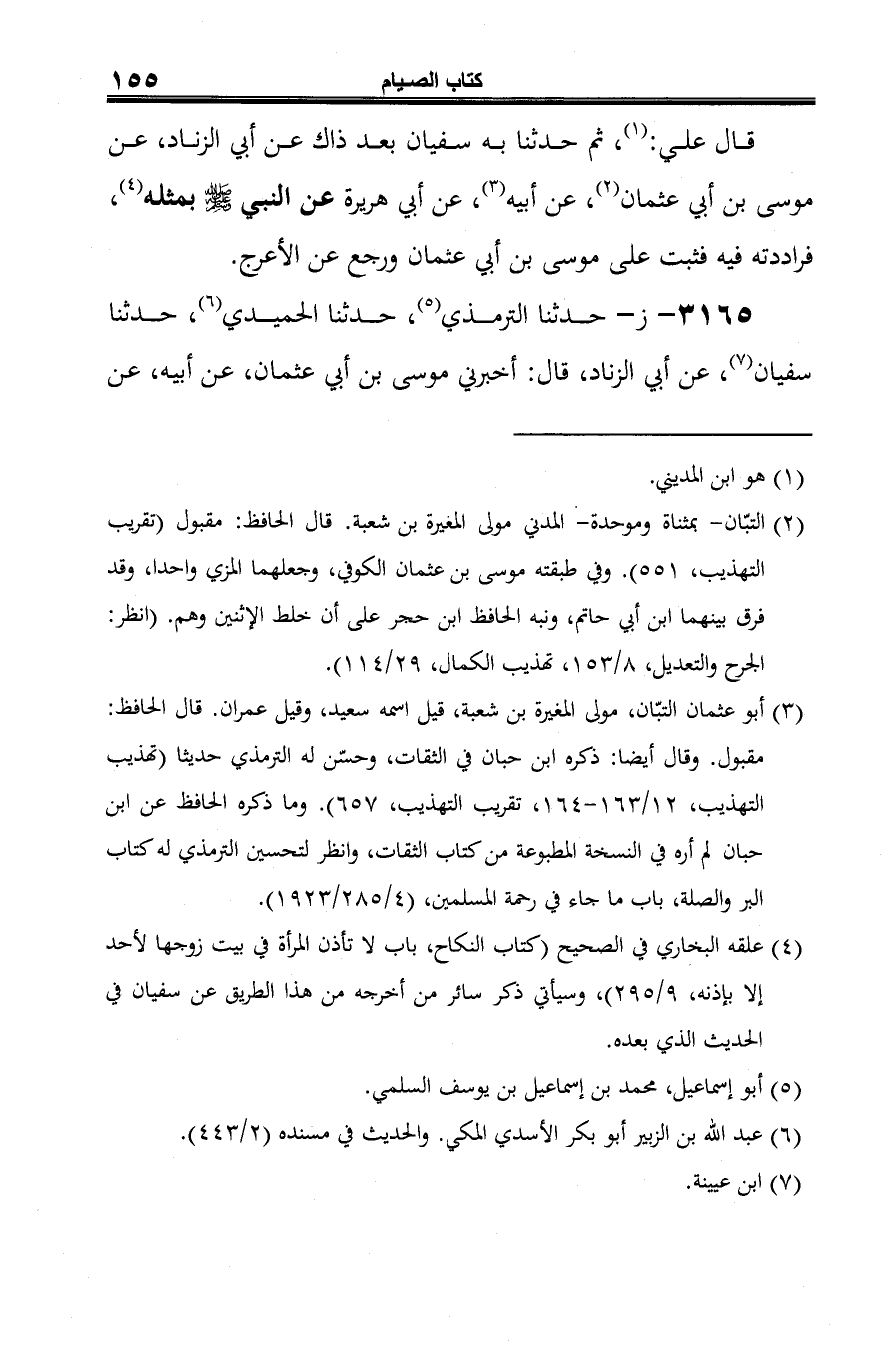 3165 - ز- حدثنا الترمذي (¬1)، حدثنا الحميدي (¬2)، حدثنا سفيان (¬3)، عن أبي الزناد، قال: أخبرني موسى بن أبي عثمان، عن أبيه، عن