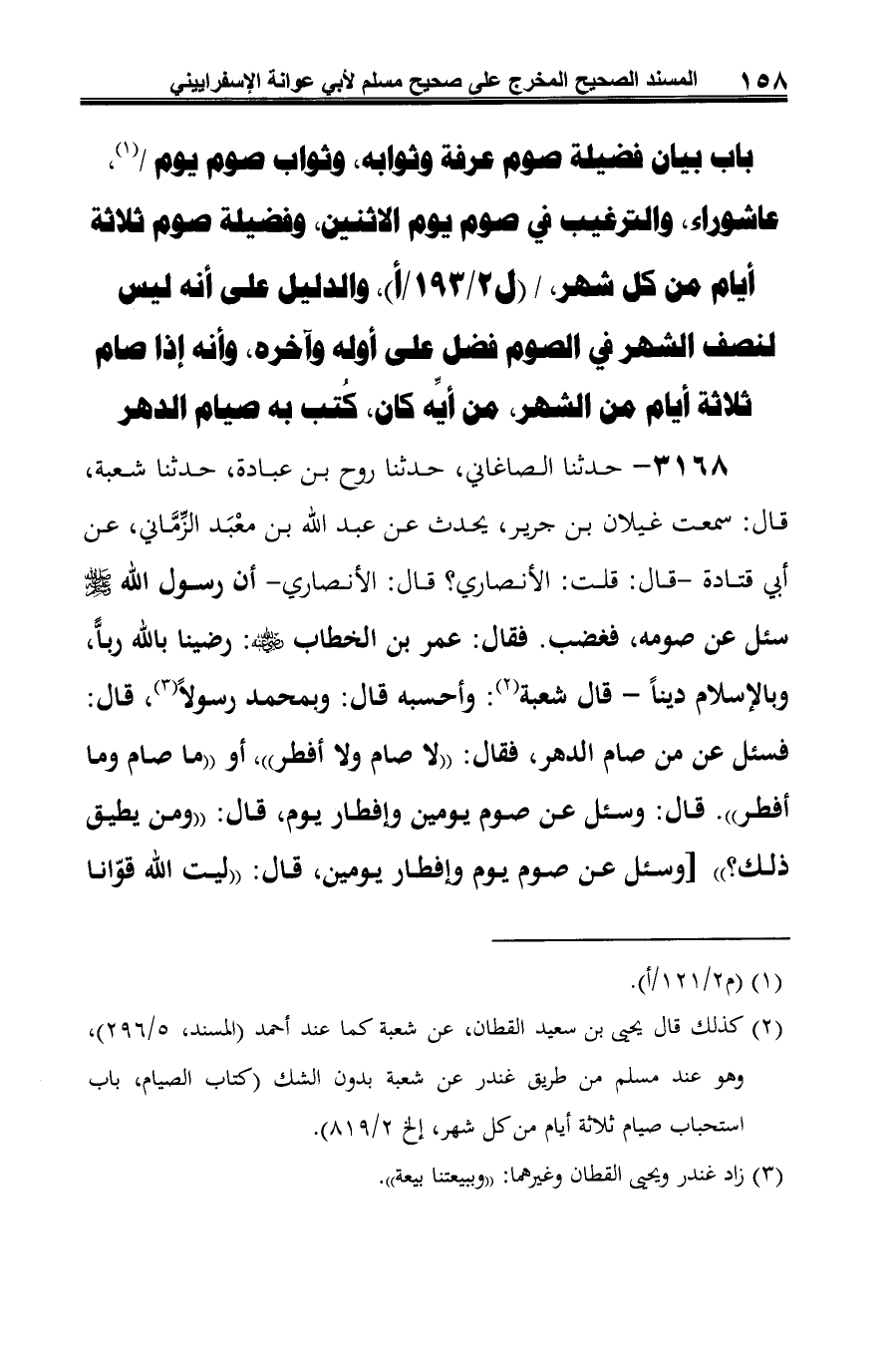 3168 - حدثنا الصاغاني، حدثنا روح بن عبادة، حدثنا شعبة، قال: سمعت غيلان بن جرير، يحدث عن عبد الله بن معْبَد الزِّمَّاني، عن أبي قتادة -قال: قلت: الأنصاري؟ قال: الأنصاري- أن رسول الله -صلى الله عليه وسلم- سئل عن صومه، فغضب. فقال: عمر بن الخطاب -رضي الله عنه-: رضينا بالله ربًّا، وبالإسلام دينًا -قال شعبة (¬1): وأحسبه قال: وبمحمد رسولًا (¬2)، قال: فسئل عن من صام الدهر، فقال: "لا صام ولا أفطر"، أو "ما صام وما أفطر". قال: وسئل عن صوم يومين وإفطار يوم، قال: "ومن يطيق ذلك؟ " [وسئل عن صوم يوم وإفطار يومين، قال: "ليت الله قوّانا