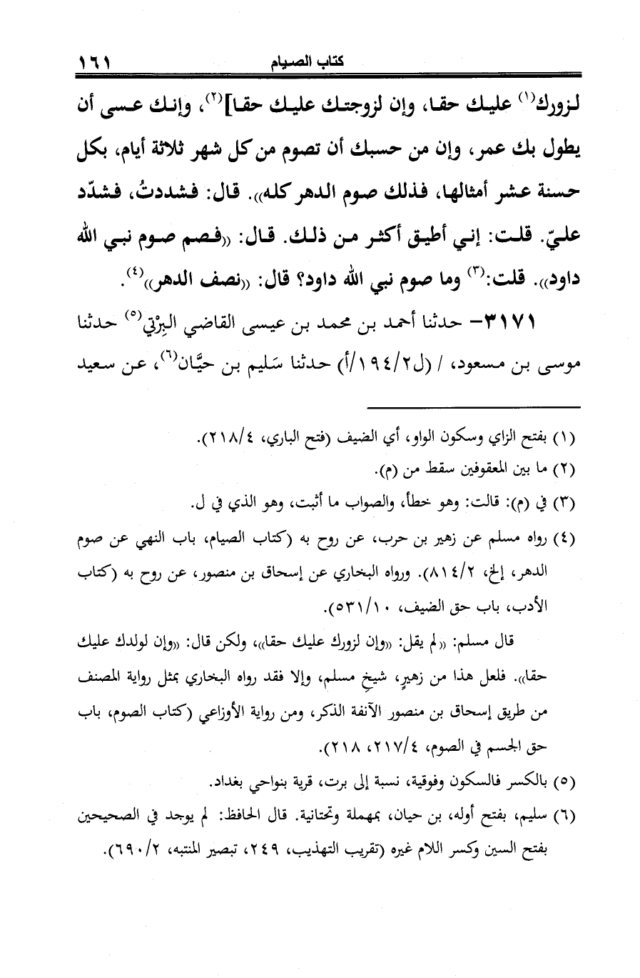 (¬4) رواه مسلم عن زهير بن حرب، ومحمد بن حاتم، عن ابن مهدي، عن سليم بن حيان به (كتاب الصيام، باب النهي عن صوم الدهر إلخ، 2/ 817). وفي إسناد المصنف أبو حذيفة موسى بن مسعود النهدي، وقد تابعه عبد الرحمن بن مهدي عند مسلم. والحديث من أفراد مسلم من بين أصحاب الكتب الستة (تحفة الأشراف، 6/ 300/ 8649).