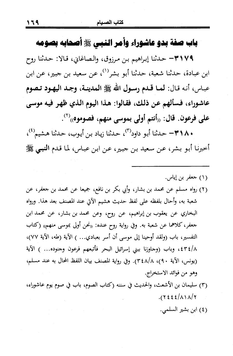 3179 - حدثنا إبراهيم بن مرزوق، والصاغاني، قالا: حدثنا روح ابن عبادة، حدثنا شعبة، حدثنا أبو بشر (¬1)، عن سعيد بن جبير، عن ابن عباس، أنه قال: لما قدم رسول الله -صلى الله عليه وسلم- المدينة، وجد اليهود تصوم عاشوراء، فسألهم عن ذلك، فقالوا: هذا اليوم الذي ظهر فيه موسى على فرعون. قال: "أنتم أولى بموسى منهم، فصوموه" (¬2).