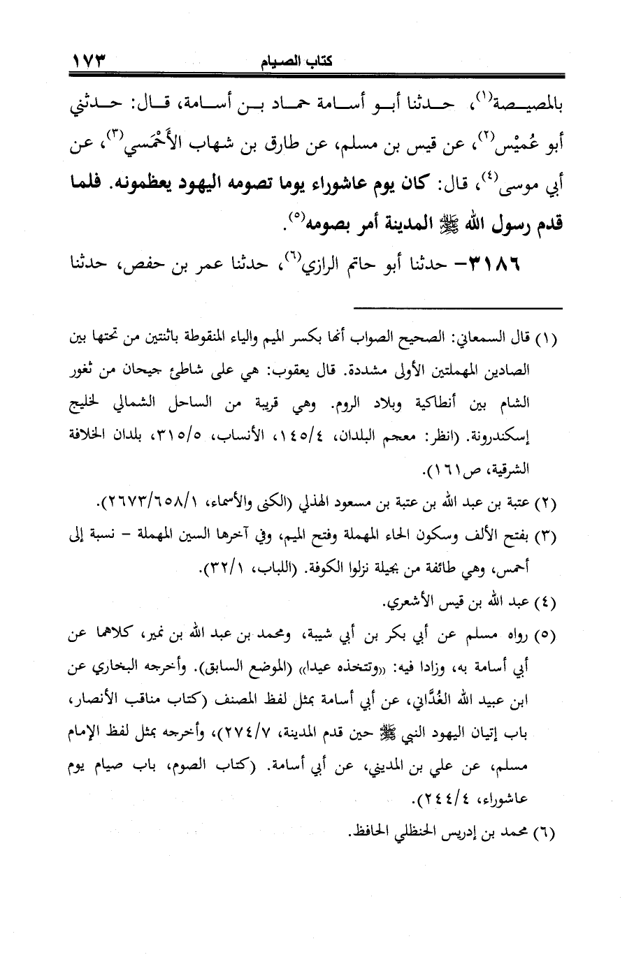 -[174]- أبي (¬2)، عن أبي عميس، عن قيس بن مسلم، عن طارق بن شهاب، عن أبي موسى، أن النبي -صلى الله عليه وسلم- قال في يوم عاشوراء: "صوموه" (¬3).