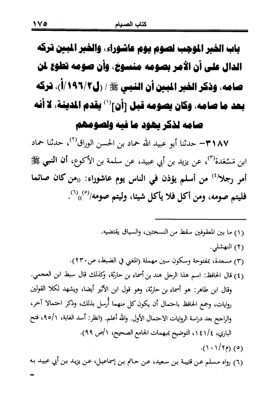 3187 - حدثنا أبو عبيد الله حماد بن الحسن الواق (¬1)، حدثنا حماد ابن مَسْعَدة (¬2)، عن يزيد بن أبي عبيد، عن سلمة بن الأكوع، أن النبي -صلى الله عليه وسلم- أمر رجلا (¬3) من أسلم يؤذن في الناس يوم عاشوراء: "من كان صائما فليتم صومه، ومن أكل فلا يأكل شيئا، وليتم صومه (¬4) " (¬5).