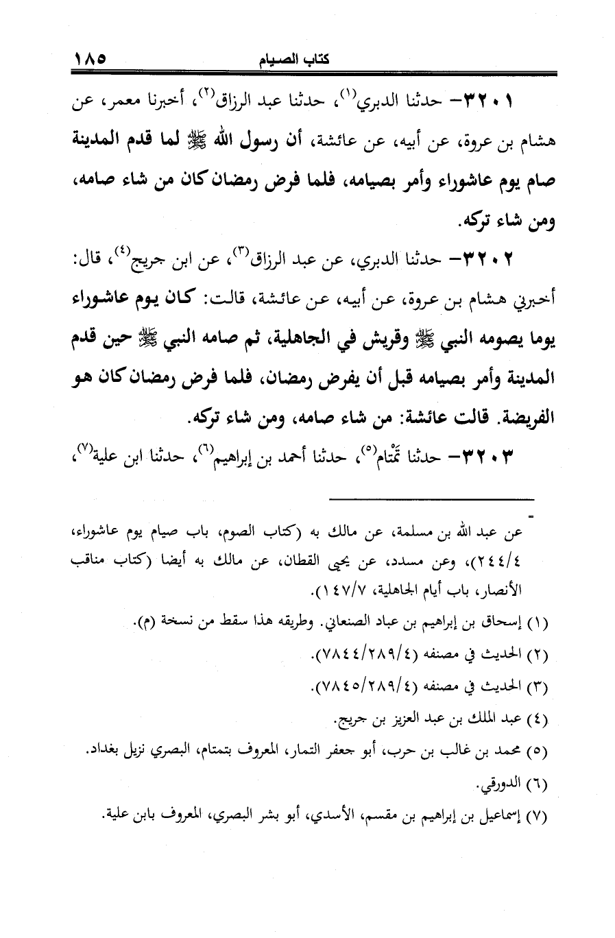 3201 - حدثنا الدبري (¬1)، حدثنا عبد الرزاق (¬2)، أخبرنا معمر، عن هشام بن عروة، عن أبيه، عن عائشة، أن رسول الله -صلى الله عليه وسلم- لما قدم المدينة صام يوم عاشوراء وأمر بصيامه، فلما فرض رمضان كان من شاء صامه، ومن شاء تركه.