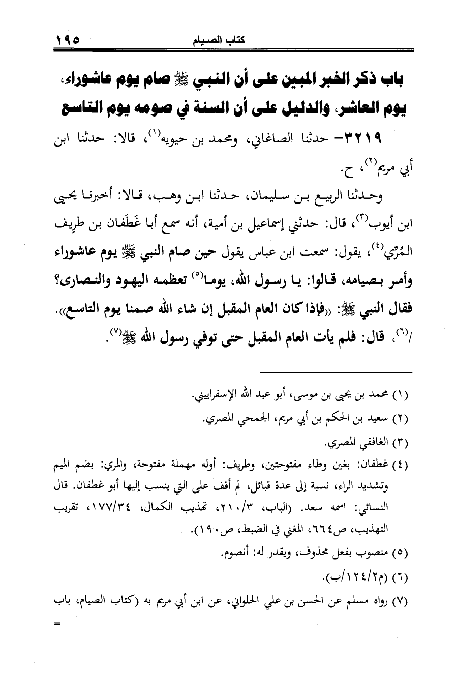 -[196]- = أي يوم يصام في عاشوراء، 2/ 797 - 798). وفي الإسناد يحيى بن أيوب الغافقي، لكن ساق له مسلم شاهدا من وجه آخر عن أبن عباس، وهو ما سيذكره المصنف بعد هذا الحديث.