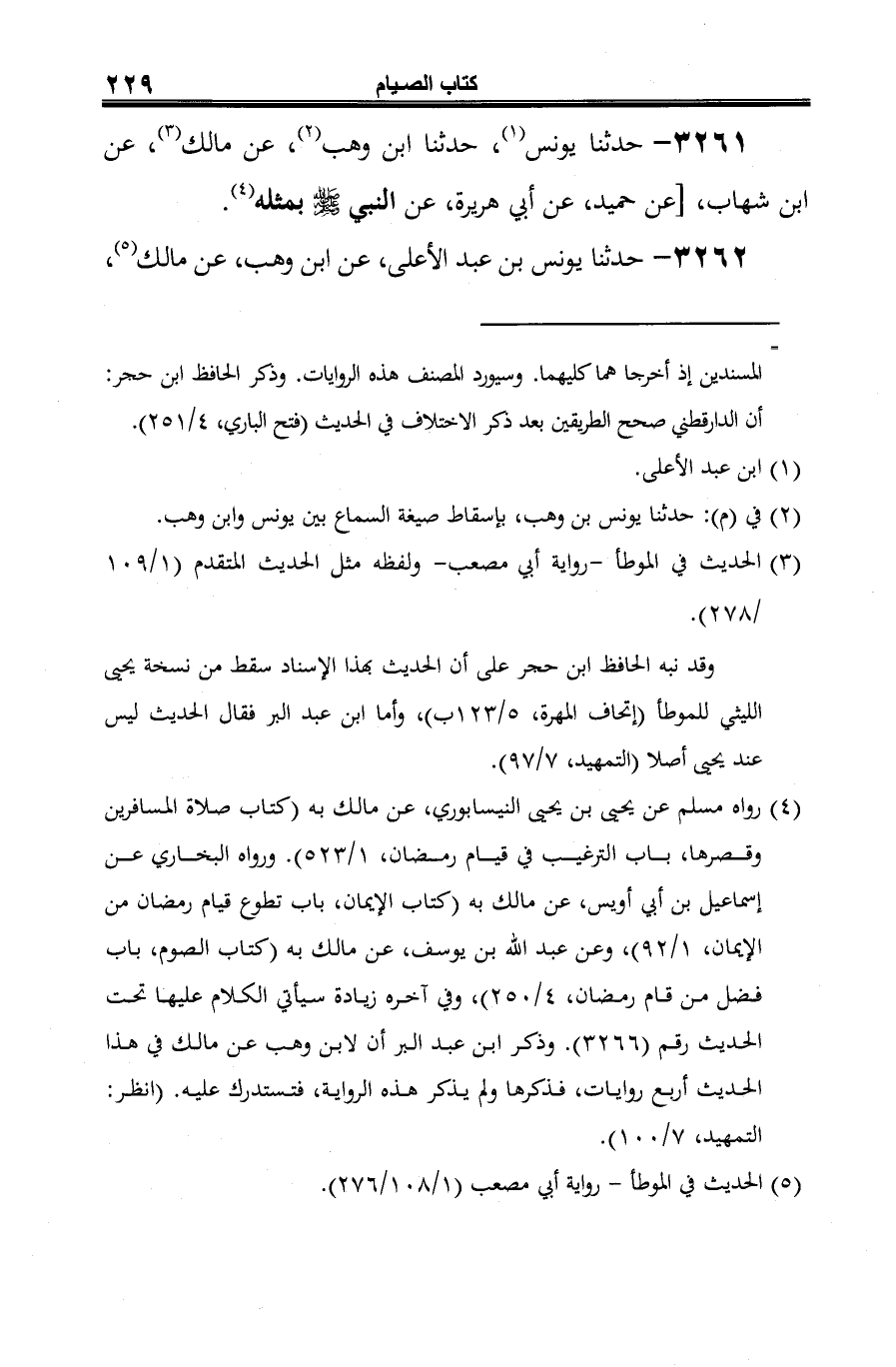 (¬4) رواه مسلم عن يحيى بن يحيى النيسابوري، عن مالك به (كتاب صلاة المسافرين وقصرها، باب الترغيب في قيام رمضان، 1/ 523). ورواه البخاري عن إسماعيل بن أبي أويس، عن مالك به (كتاب الإيمان، باب تطوع قيام رمضان من الإيمان، 1/ 92)، وعن عبد الله بن يوسف، عن مالك به (كتاب الصوم، باب فضل من قام رمضان، 4/ 250)، وفي آخره زيادة سيأتي الكلام عليها تحت الحديث رقم (3266). وذكر ابن عبد البر أن لابن وهب عن مالك في هذا الحديث أربع روايات، فذكرها ولم يذكر هذه الرواية، فتستدرك عليه. (انظر: التمهيد، 7/ 100).