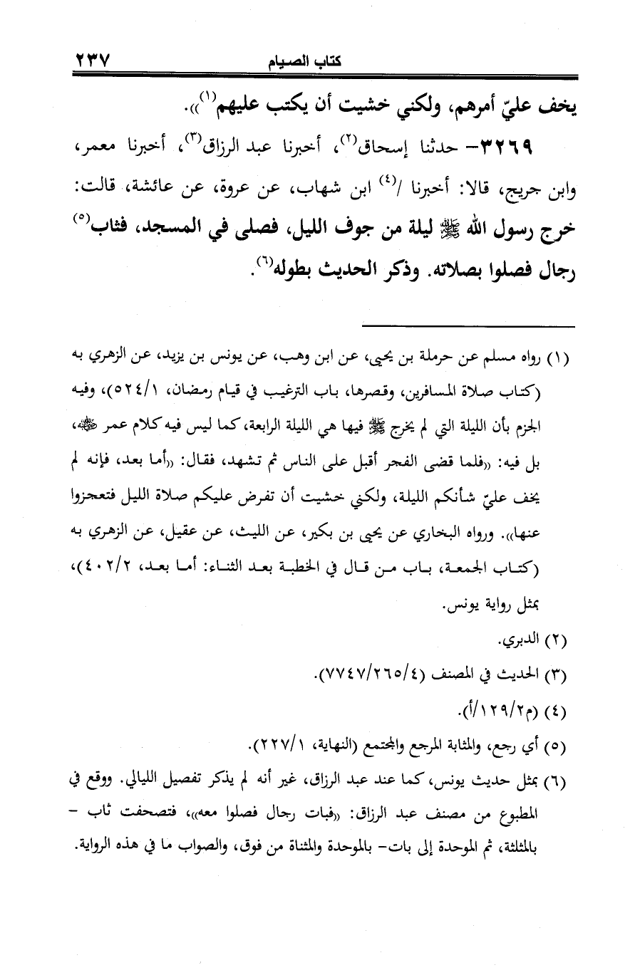 3269 - حدثنا إسحاق (¬1)، أخبرنا عبد الرزاق (¬2)، أخبرنا معمر، وابن جريج، قالا: أخبرنا (¬3) ابن شهاب، عن عروة، عن عائشة، قالت: خرج رسول الله -صلى الله عليه وسلم- ليلة من جوف الليل، فصلى في المسجد، فثاب (¬4) رجال فصلوا بصلاته. وذكر الحديث بطوله (¬5).