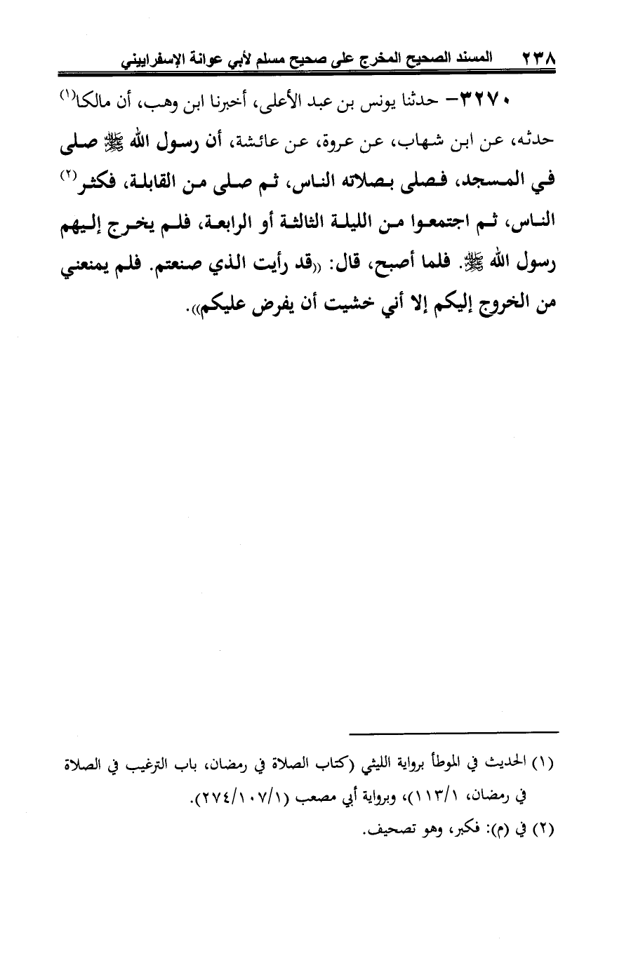 3270 - حدثنا يونس بن عبد الأعلى، أخبرنا ابن وهب، أن مالكا (¬1) حدثه، عن ابن شهاب، عن عروة، عن عائشة، أن رسول الله -صلى الله عليه وسلم- صلى في المسجد، فصلى بصلاته الناس، ثم صلى من القابلة، فكثر (¬2) الناس، ثم اجتمعوا من الليلة الثالثة أو الرابعة، فلم يخرج إليهم رسول الله -صلى الله عليه وسلم-. فلما أصبح، قال: "قد رأيت الذي صنعتم. فلم يمنعني من الخروج إليكم إلا أني خشيت أن يفرض عليكم".