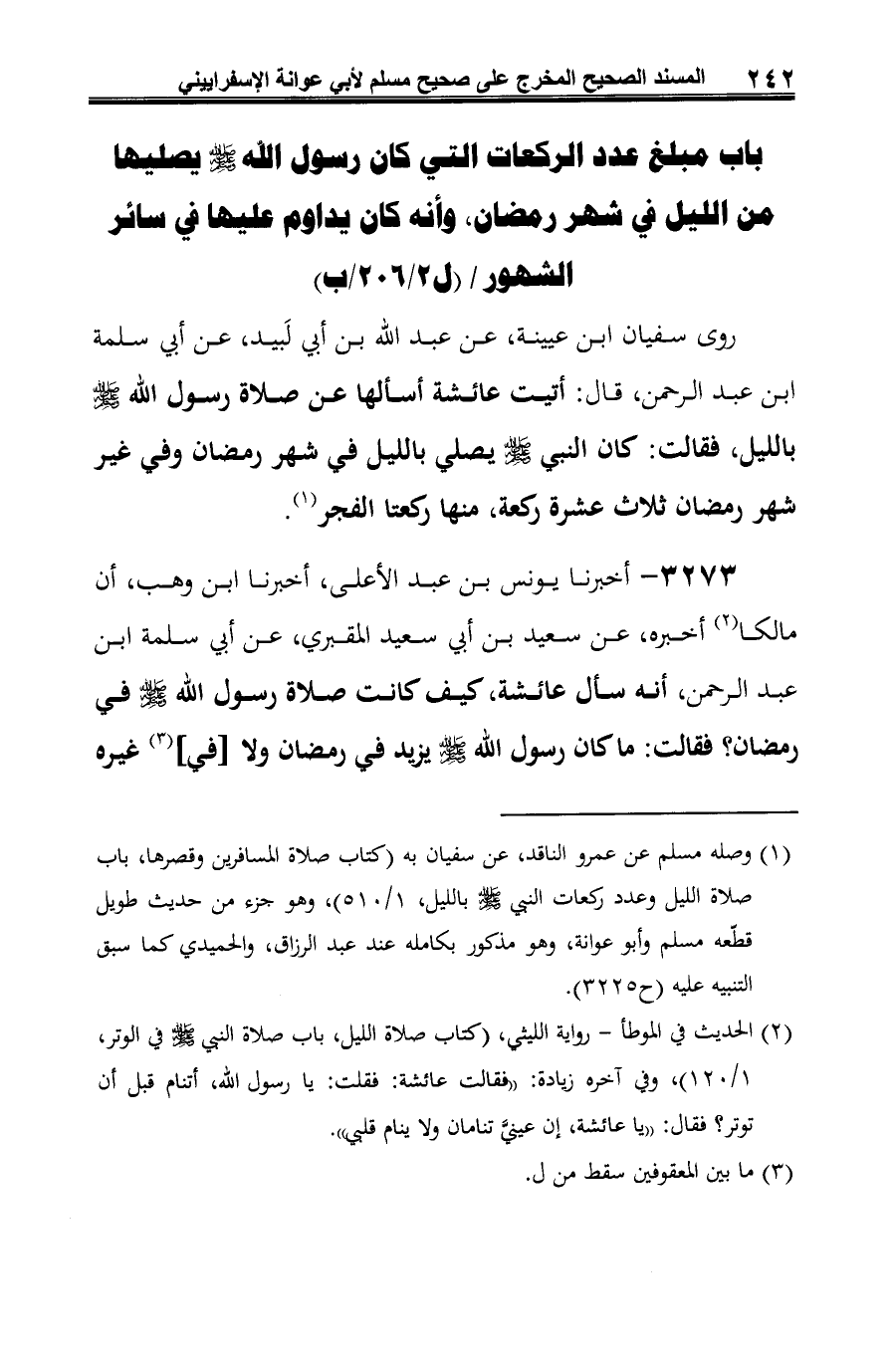 -[243]- على إحدى عشرة ركعة. يصلي أربعا، فلا تسأل عن حسنهن وطولهن، [ثم يصلي أربعا، فلا تسأل عن حُسنهن وطولهن] (¬3)، ثم يصلي ثلاثا (¬4).