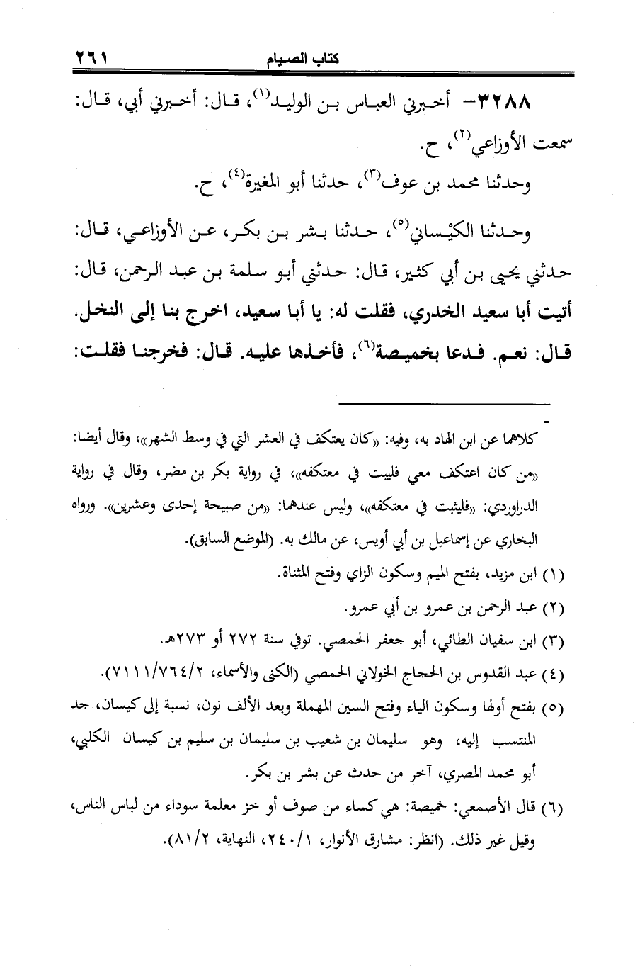 وحدثنا الكيْساني (¬5)، حدثنا بشر بن بكر، عن الأوزاعي، قال: حدثني يحيى بن أبي كثير، قال: حدثني أبو سلمة بن عبد الرحمن، قال: أتيت أبا سعيد الخدري، فقلت له: يا أبا سعيد، اخرج بنا إلى النخل. قال: نعم. فدعا بخميصة (¬6)، فأخذها عليه. قال: فخرجنا فقلت: