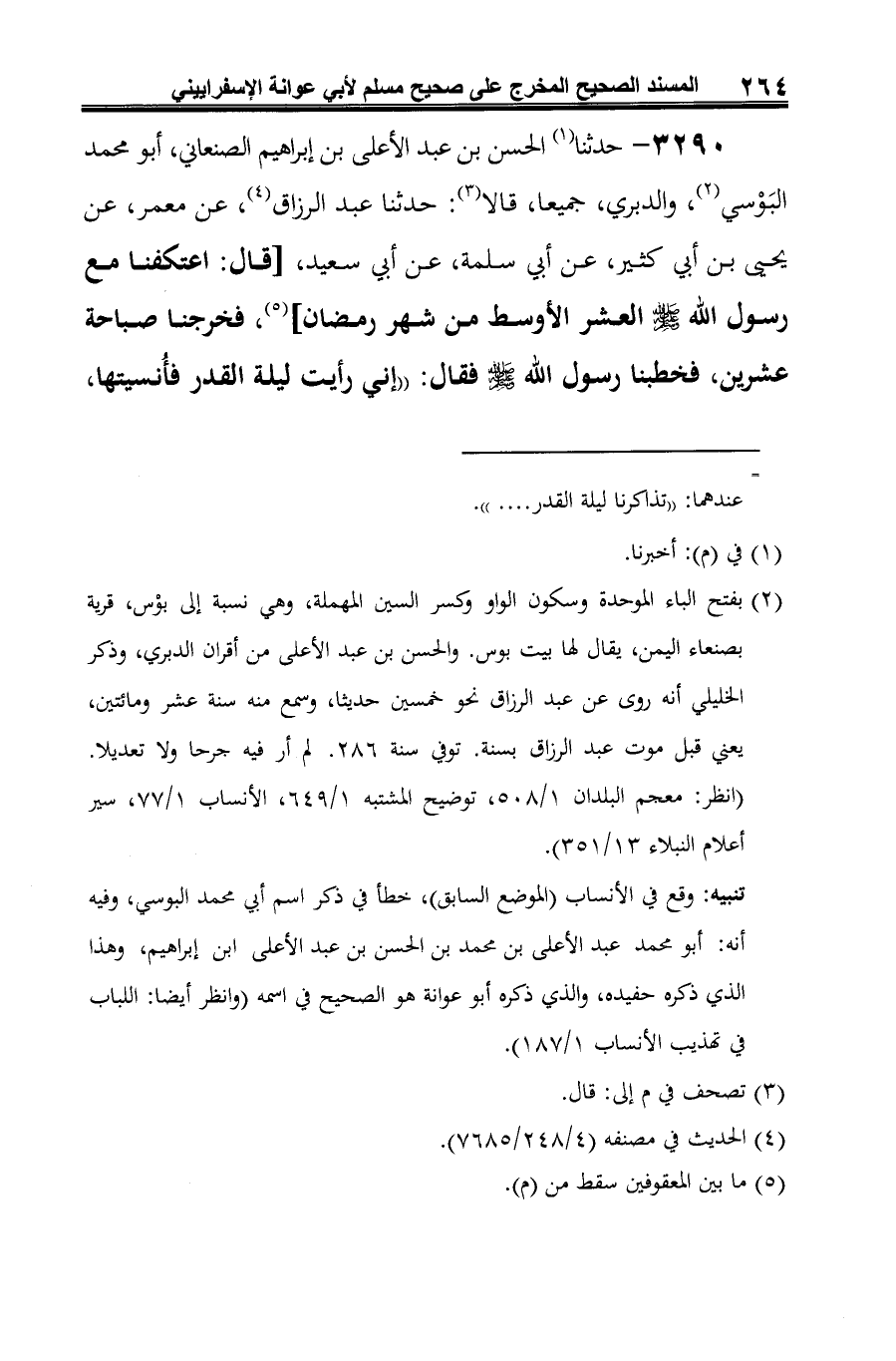 3290 - حدثنا (¬1) الحسن بن عبد الأعلى بن إبراهيم الصنعاني، أبو محمد البَوْسي (¬2)، والدبري، جميعا، قالا (¬3): حدثنا عبد الرزاق (¬4)، عن معمر، عن يحيى بن أبي كثير، عن أبي سلمة، عن أبي سعيد، [قال: اعتكفنا مع رسول الله -صلى الله عليه وسلم- العشر الأوسط من شهر رمضان] (¬5)، فخرجنا صباحة عشرين، فخطبنا رسول الله -صلى الله عليه وسلم- فقال: "إني رأيت ليلة القدر فأُنسيتها،