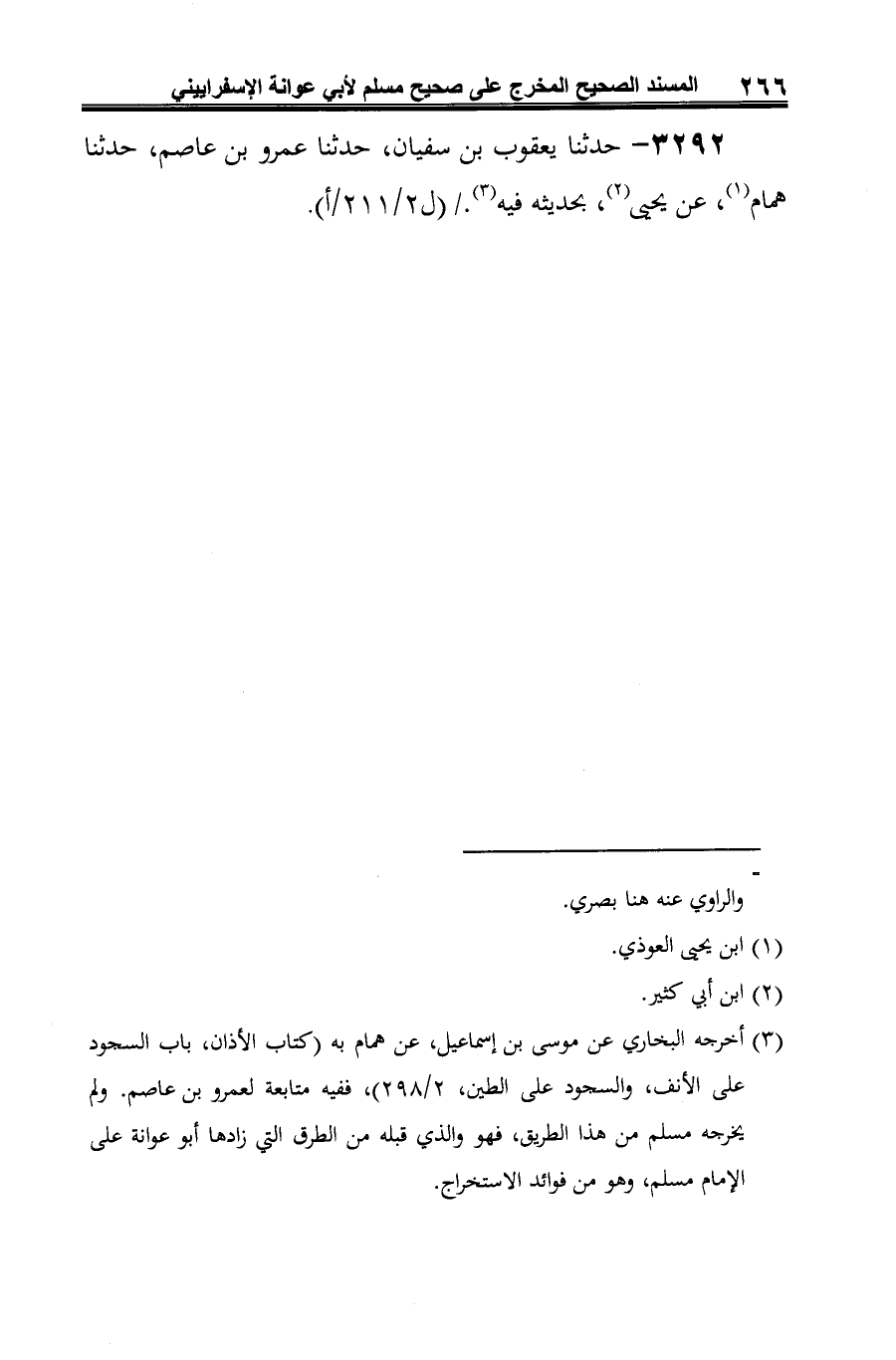 (¬3) أخرجه البخاري عن موسى بن إسماعيل، عن همام به (كتاب الأذان، باب السجود على الأنف، والسجود على الطين، 2/ 298)، ففيه متابعة لعمرو بن عاصم. ولم يخرجه مسلم من هذا الطريق، فهو والذي قبله من الطرق التي زادها أبو عوانة على الإمام مسلم، وهو من فوائد الاستخراج.