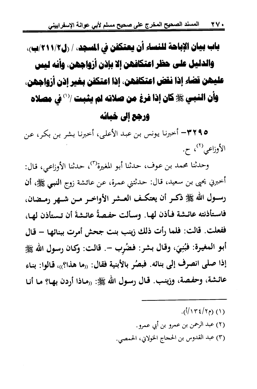 (¬3) رواه مسلم عن سلمة بن شبيب، عن أبي المغيرة، عن الأوزاعي به، ولم يذكر لفظه، فأفادت رواية أبي عوانة بيان اللفظ المحال به (كتاب الاعتكاف، باب متى يدخل من أراد الاعتكاف في معتكفه، 2/ 832). ورواه البخاري عن محمد بن مقاتل، عن ابن المبارك، عن الأوزاعي بمثل لفظ أبي المغيرة (كتاب الاعتكاف، باب من أراد أن يعتكف ثم بدا له أن يخرج، 4/ 285).