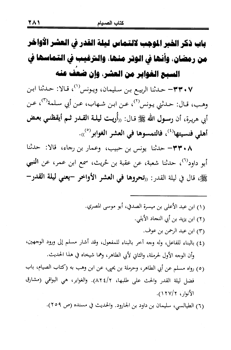 3308 - حدثنا يونس بن حبيب، وعمار بن رجاء، قالا: حدثنا أبو داود (¬1)، حدثنا شعبة، عن عقبة بن حُريث، سمع ابن عمر، عن النبي -صلى الله عليه وسلم-، قال في ليلة القدر: "تحروها في العشر الأواخر -يعني ليلة القدر-
