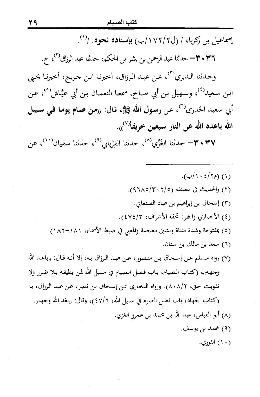 (¬6) رواه مسلم عن إسحاق بن منصور، عن عبد الرزاق به، إلا أنه قال: "باعد الله وجهه"، (كتاب الصيام، باب فضل الصيام في سبيل الله لمن يطيقه بلا ضرر ولا تفويت حق، 2/ 808). ورواه البخاري عن إسحاق بن نصر، عن عبد الرزاق، به (كتاب الجهاد، باب فضل الصوم في سبيل الله، 6/ 47)، وقال: "بعّد الله وجهه".