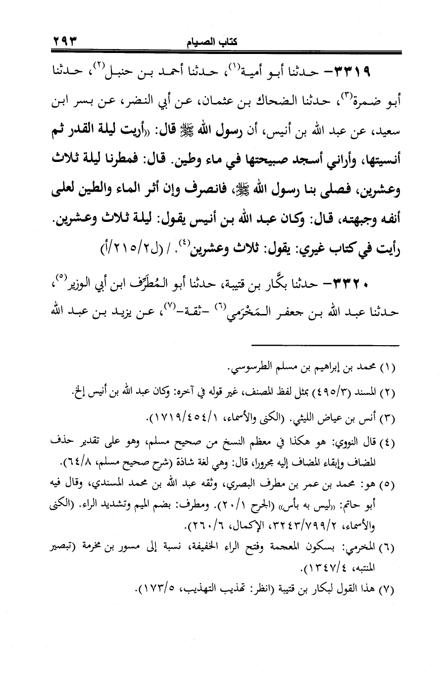 3319 - حدثنا أبو أمية (¬1)، حدثنا أحمد بن حنبل (¬2)، حدثنا أبو ضمرة (¬3)، حدثنا الضحاك بن عثمان، عن أبي النضر، عن بسر ابن سعيد، عن عبد الله بن أنيس، أن رسول الله -صلى الله عليه وسلم- قال: "أريت ليلة القدر ثم أنسيتها، وأراني أسجد صبيحتها في ماء وطين. قال: فمطرنا ليلة ثلاث وعشرين، فصلى بنا رسول الله -صلى الله عليه وسلم-، فانصرف وإن أثر الماء والطين لعلى أنفه وجبهته، قال: وكان عبد الله بن أنيس يقول: ليلة ثلاث وعشرين. رأيت في كتاب غيري: يقول: ثلاث وعشرين (¬4).