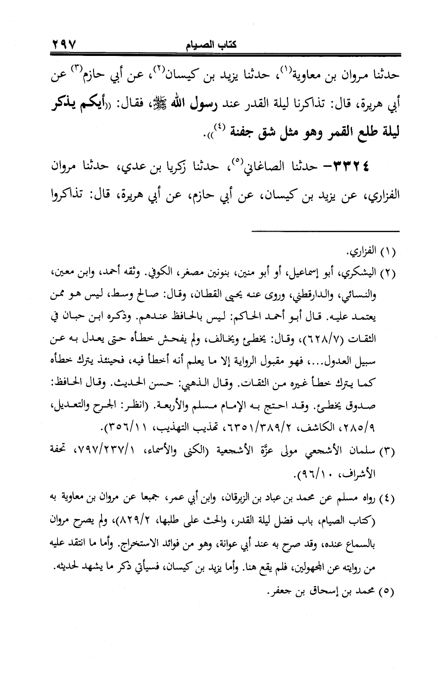 3324 - حدثنا الصاغاني (¬1)، حدثنا زكريا بن عدي، حدثنا مروان الفزاري، عن يزيد بن كيسان، عن أبي حازم، عن أبي هريرة، قال: تذاكروا