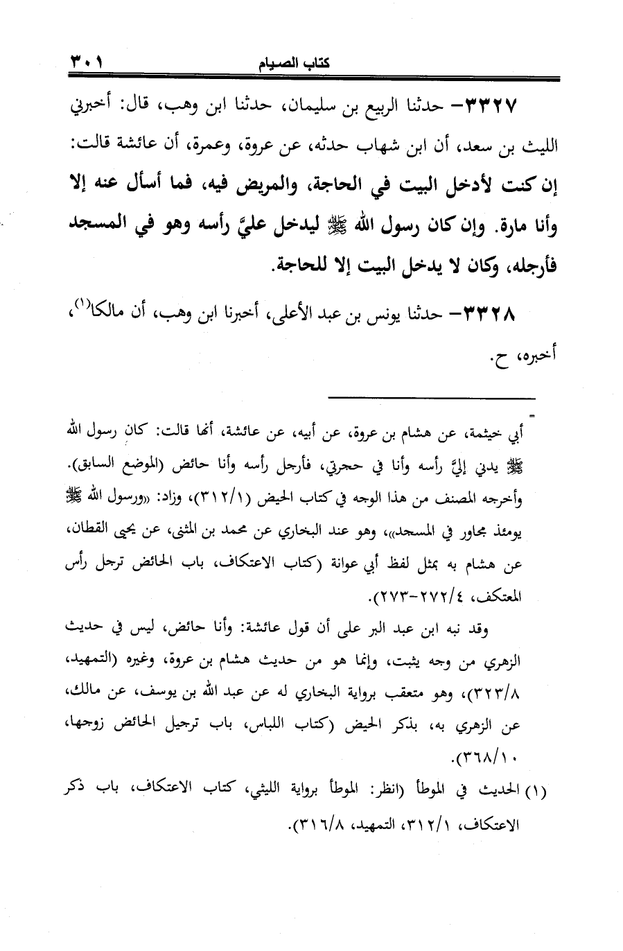 3327 - حدثنا الربيع بن سليمان، حدثنا ابن وهب، قال: أخبرني الليث بن سعد، أن ابن شهاب حدثه، عن عروة، وعمرة، أن عائشة قالت: إن كنت لأدخل البيت في الحاجة، والمريض فيه، فما أسأل عنه إلا وأنا مارة. وإن كان رسول الله - صلي الله عليه وسلم - ليدخل عليَّ رأسه وهو في المسجد فأرجله، وكان لا يدخل البيت إلا للحاجة.