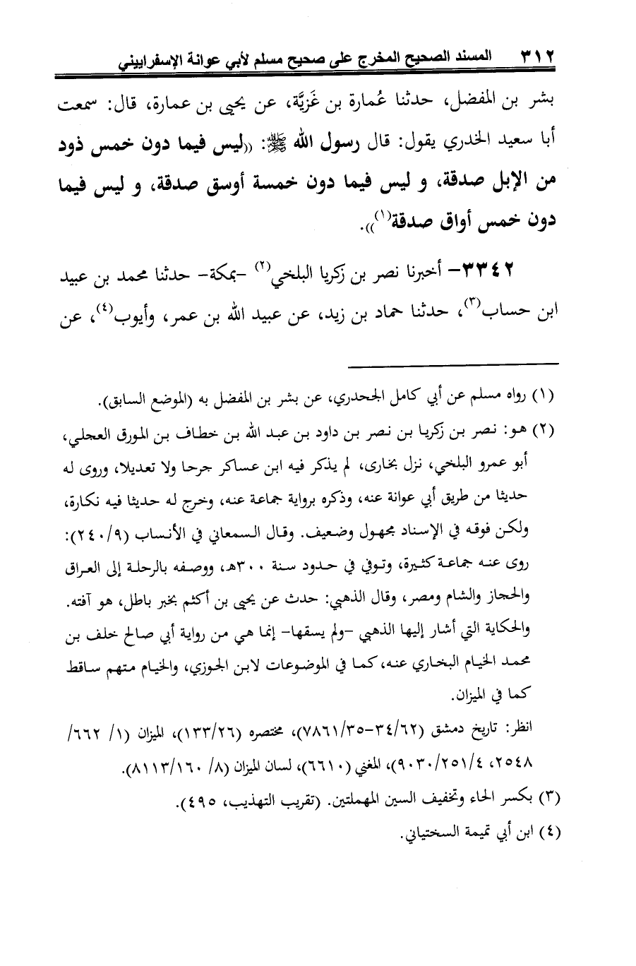 (¬4) لم يخرجه مسلم من حديث عبيد الله بن عمر، ولا من حديث أيوب، فهو من الطرق المزيدة عند أبي عوانة. وقد قال الطبراني: لم يروه عن أيوب إلا حماد، تفرد به ابن حساب (المعجم الصغير، 1/ 235). وقال أبو حاتم عن الإسناد: إنه خطأ، ليس فيه أيوب. وذكر من طريق عارم، عن حماد بن زيد، عن عبيد الله بن عمر، عن عمرو بن يحيى به، ئم قال: فلو قال: يحيى بن سعيد، كان يحتمل، لأن هذا الحديث عند يحيى بن سعيد (علل ابن أبي حاتم، 1/ 215). والذي يُقوي قول أبي حاتم أن النسائي روى الحديث عن أحمد بن عبدة، عن حماد بن زيد، عن يحيى بن سعيد، وعبيد الله بن عمر، عن عمرو بن يحيى به (المجتبى، كتاب الزكاة، باب القدر الذي تجب فيه الصدقة، 5/ 40/ 2486). ومقتضى صنيع ابن حبان تصحيح رواية محمد بن عبيد، حيث أخرجها في صحيحه (الإحسان، 8/ 62 /3268).