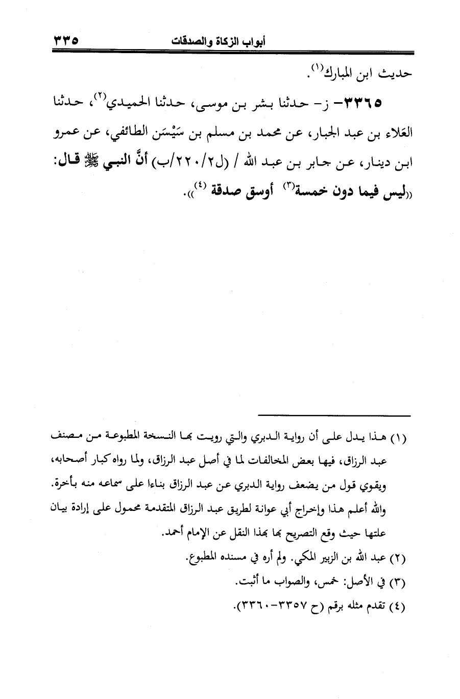 3365 - ز- حدثنا بشر بن موسى، حدثنا الحميدي (¬1)، حدثنا العَلاء بن عبد الجبار، عن محمد بن مسلم بن سَيْسَن الطائفي، عن عمرو ابن دينار، عن جابر بن عبد الله أنَّ النبي -صلى الله عليه وسلم- قال: "ليس فيما دون خمسة (¬2) أوسق صدقة (¬3) ".