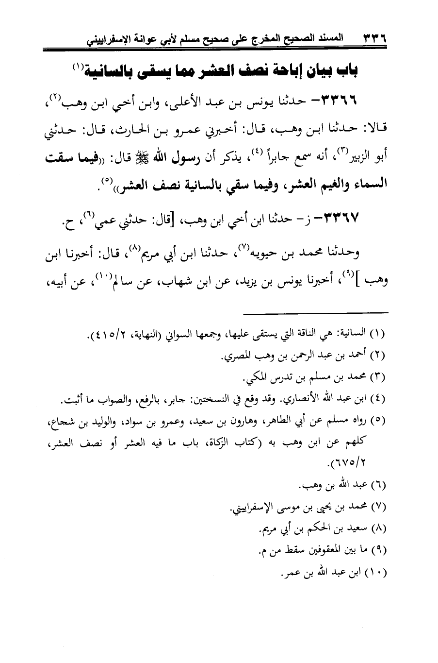 3366 - حدثنا يونس بن عبد الأعلى، وابن أخي ابن وهب (¬1)، قالا: حدثنا ابن وهب، قال: أخبرني عمرو بن الحارث، قال: حدثني أبو الزبير (¬2)، أنه سمع جابرًا (¬3)، يذكر أن رسول الله -صلى الله عليه وسلم- قال: "فيما سقت السماء والغيم العشر، وفيما سقي بالسانية نصف العشر" (¬4).
