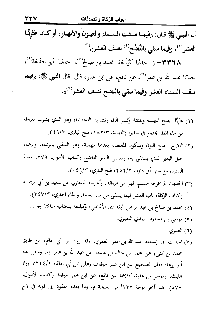3368 - ز- حدثنا كَيْلَجَة محمد بن صالح (¬1)، حدثنا أبو حذيفة (¬2)، حدثنا عبد الله بن عمر (¬3)، عن نافع، عن ابن عمر، قال: قال النبي -صلى الله عليه وسلم-: "فيما سقت السماء العشر وفيما سقي بالنضح نصف العشر (¬4).