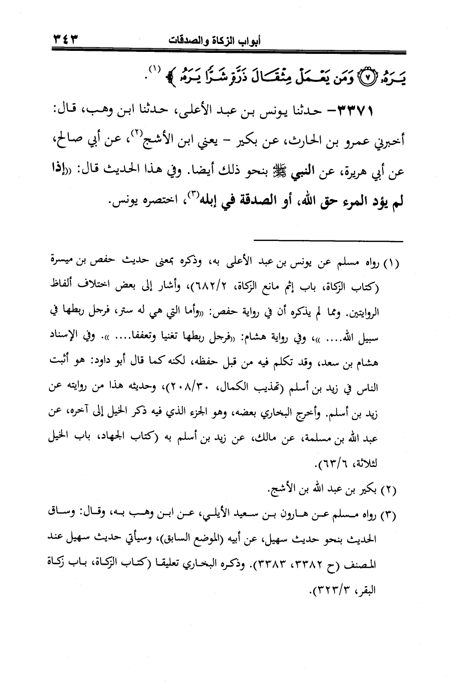 3371 - حدثنا يونس بن عبد الأعلى، حدثنا ابن وهب، قال: أخبرني عمرو بن الحارث، عن بكير -يعني ابن الأشج (¬1)، عن أبي صالح، عن أبي هريرة، عن النبي -صلى الله عليه وسلم- بنحو ذلك أيضا. وفي هذا الحديث قال: "إذا لم يؤد المرء حق الله، أو الصددقة في إبله (¬2)، اختصره يونس.