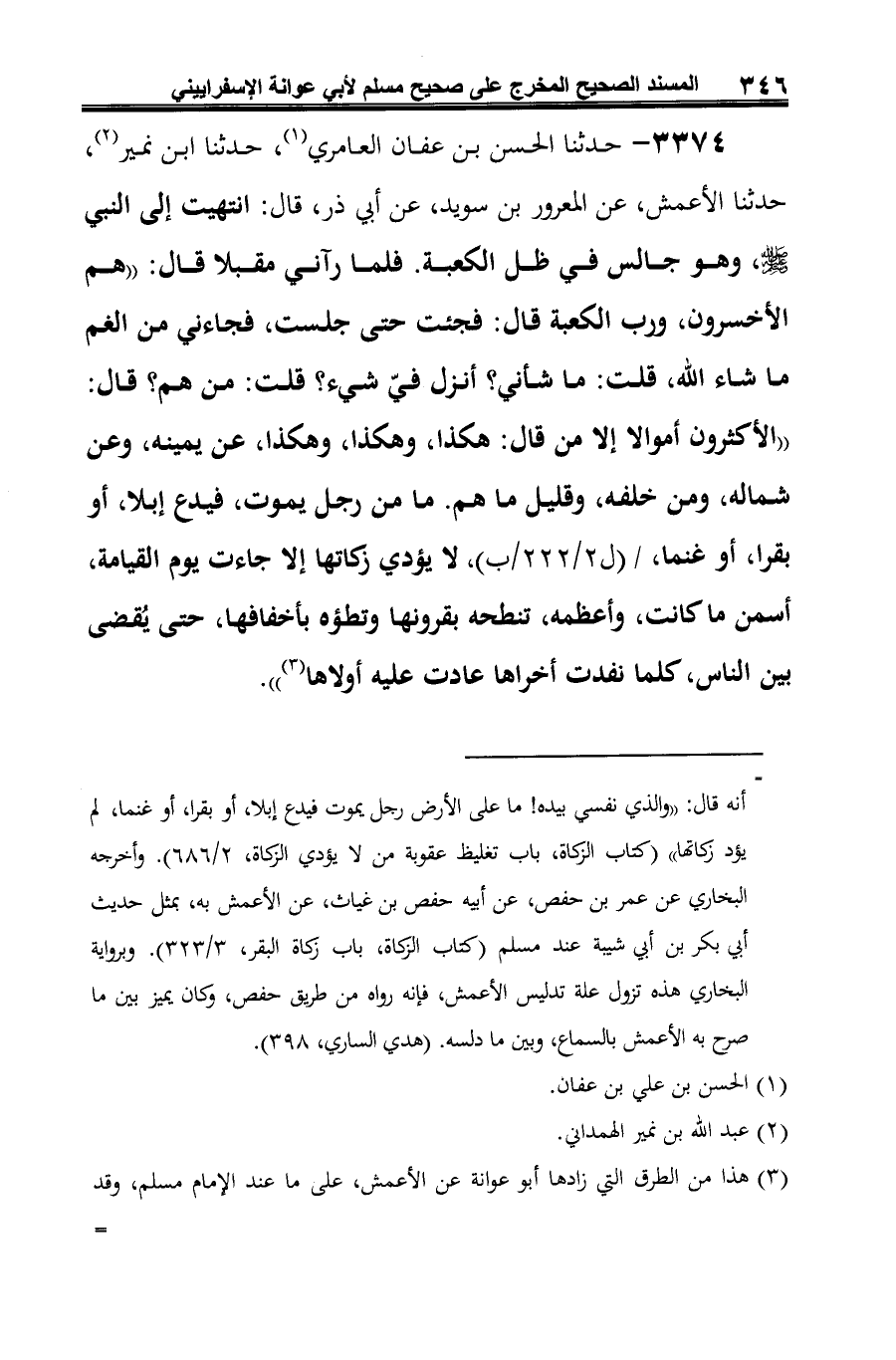 3374 - حدثنا الحسن بن عفان العامري (¬1)، حدثنا ابن نمير (¬2)، حدثنا الأعمش، عن المعرور بن سويد، عن أبي ذر، قال: انتهيت إلى النبي -صلى الله عليه وسلم-، وهو جالس في ظل الكعبة. فلما رآني مقبلا قال: "هم الأخسرون، ورب الكعبة قال: فجئت حتى جلست، فجاءني من الغم ما شاء الله، قلت: ما شأني؟ أنزل فيّ شيء؟ قلت: من هم؟ قال: "الأكثرون أموالا إلا من قال: هكذا، وهكذا، وهكذا، عن يمينه، وعن شماله، ومن خلفه، وقليل ما هم. ما من رجل يموت، فيدع إبلا، أو بقرا، أو غنما، لا يؤدي زكاتها إلا جاءت يوم القيامة، أسمن ما كانت، وأعظمه، تنطحه بقرونها وتطؤه بأخفافها، حتى يُقضى بين الناس، كلما نفدت أخراها عادت عليه أولاها (¬3) ".
