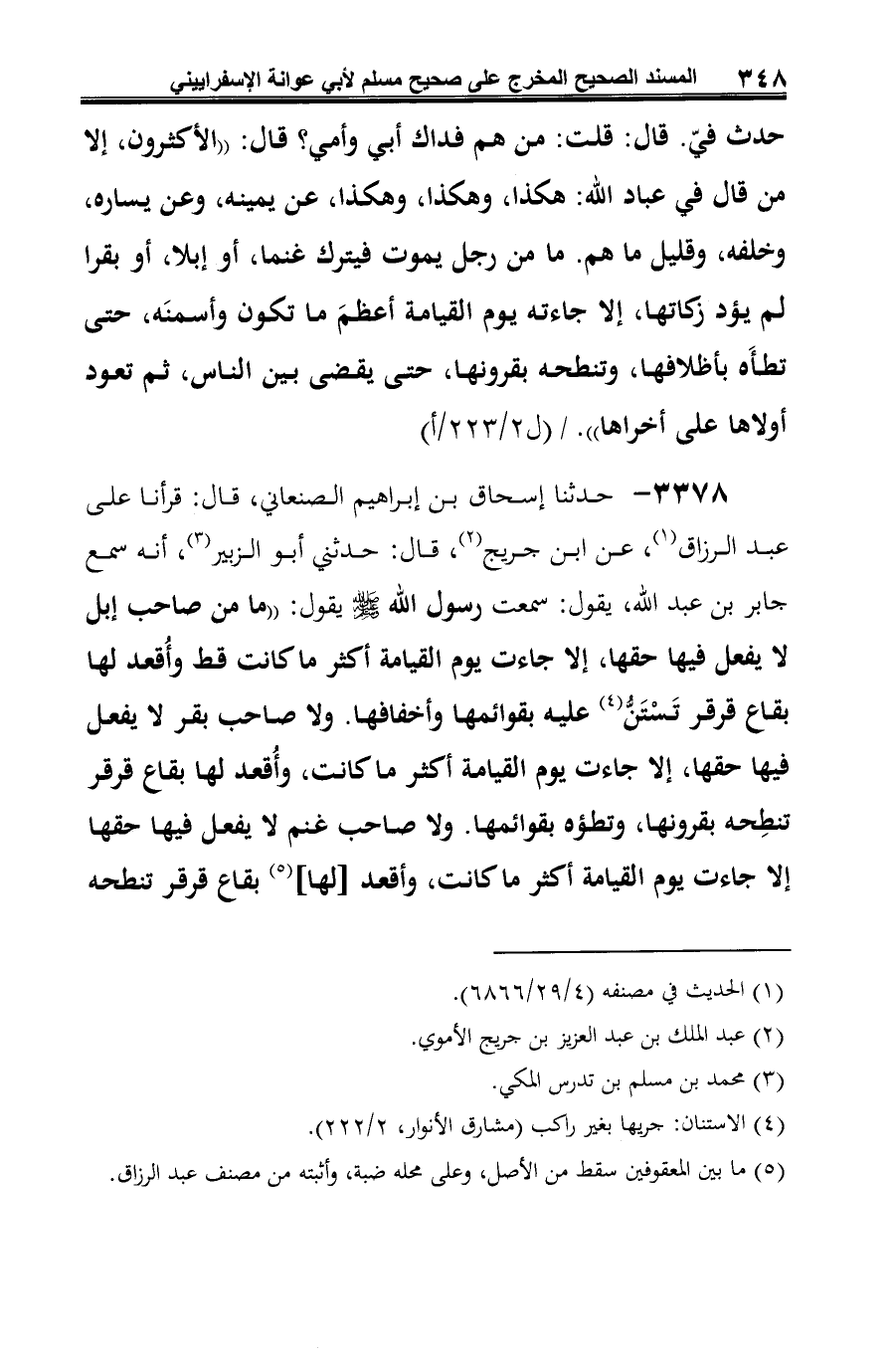 3378 - حدثنا إسحاق بن إبراهيم الصنعاني، قال: قرأنا على عبد الرزاق (¬1)، عن ابن جريج (¬2)، قال: حدثني أبو الزبير (¬3)، أنه سمع جابر بن عبد الله، يقول: سمعت رسول الله -صلى الله عليه وسلم- يقول: "ما من صاحب إبل لا يفعل فيها حقها، إلا جاءت يوم القيامة أكثر ما كانت قط وأُقعد لها بقاع قرقر تَسْتَنُّ (¬4) عليه بقوائمها وأخفافها. ولا صاحب بقر لا يفعل فيها حقها، إلا جاءت يوم القيامة أكثر ما كانت، وأُقعد لها بقاع قرقر تنطِحه بقرونها، وتطؤه بقوائمها. ولا صاحب غنم لا يفعل فيها حقها إلا جاءت يوم القيامة أكثر ما كانت، وأقعد [لها]، (¬5) بقاع قرقر تنطحه