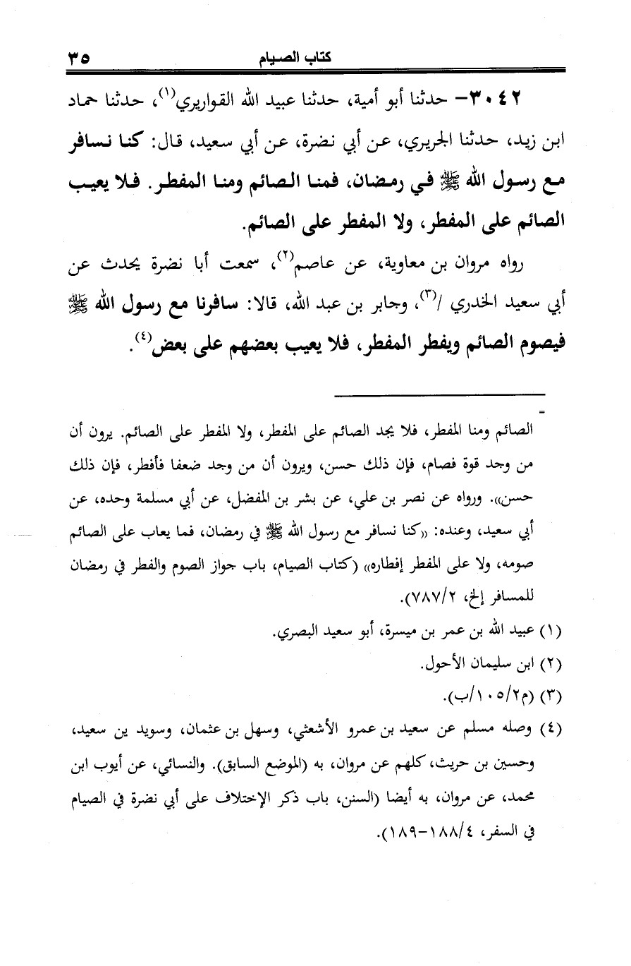 3042 - حدثنا أبو أمية، حدثنا عبيد الله القواريري (¬1)، حدثنا حماد ابن زيد، حدثنا الجريري، عن أبي نضرة، عن أبي سعيد، قال: كنا نسافر مع رسول الله -صلى الله عليه وسلم- في رمضان، فمنا الصائم ومنا المفطر. فلا يعيب الصائم على المفطر، ولا المفطر على الصائم.