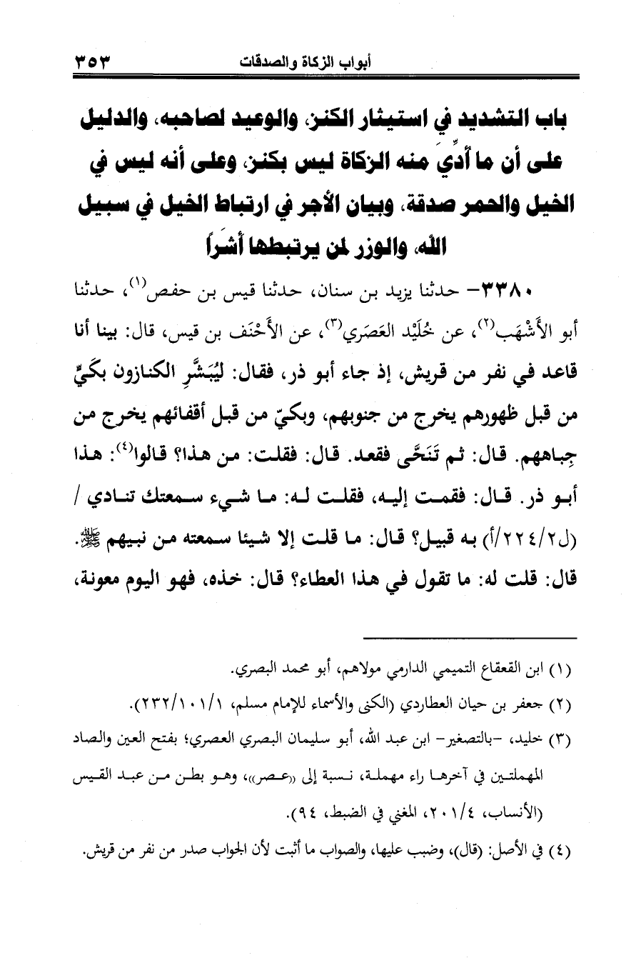 3380 - حدثنا يزيد بن سنان، حدثنا قيس بن حفص (¬1)، حدثنا أبو الأَشْهَب (¬2)، عن خُلَيْد العَصَري (¬3)، عن الأَحْنَف بن قيس، قال: بينا أنا قاعد في نفر من قريش، إذ جاء أبو ذر، فقال: ليُبَشَّرِ الكنازون بكَيِّ من قبل ظهورهم يخرج من جنوبهم، وبكيّ من قبل أقفائهم يخرج من جِباههم. قال: ثم تَنَحَّى فقعد. قال: فقلت: من هذا؟ قالوا (¬4): هذا أبو ذر. قال: فقمت إليه، فقلت له: ما شيء سمعتك تنادي به قبيل؟ قال: ما قلت إلا شيئا سمعته من نبيهم -صلى الله عليه وسلم-. قال: قلت له: ما تقول في هذا العطاء؟ قال: خذه، فهو اليوم معونة،