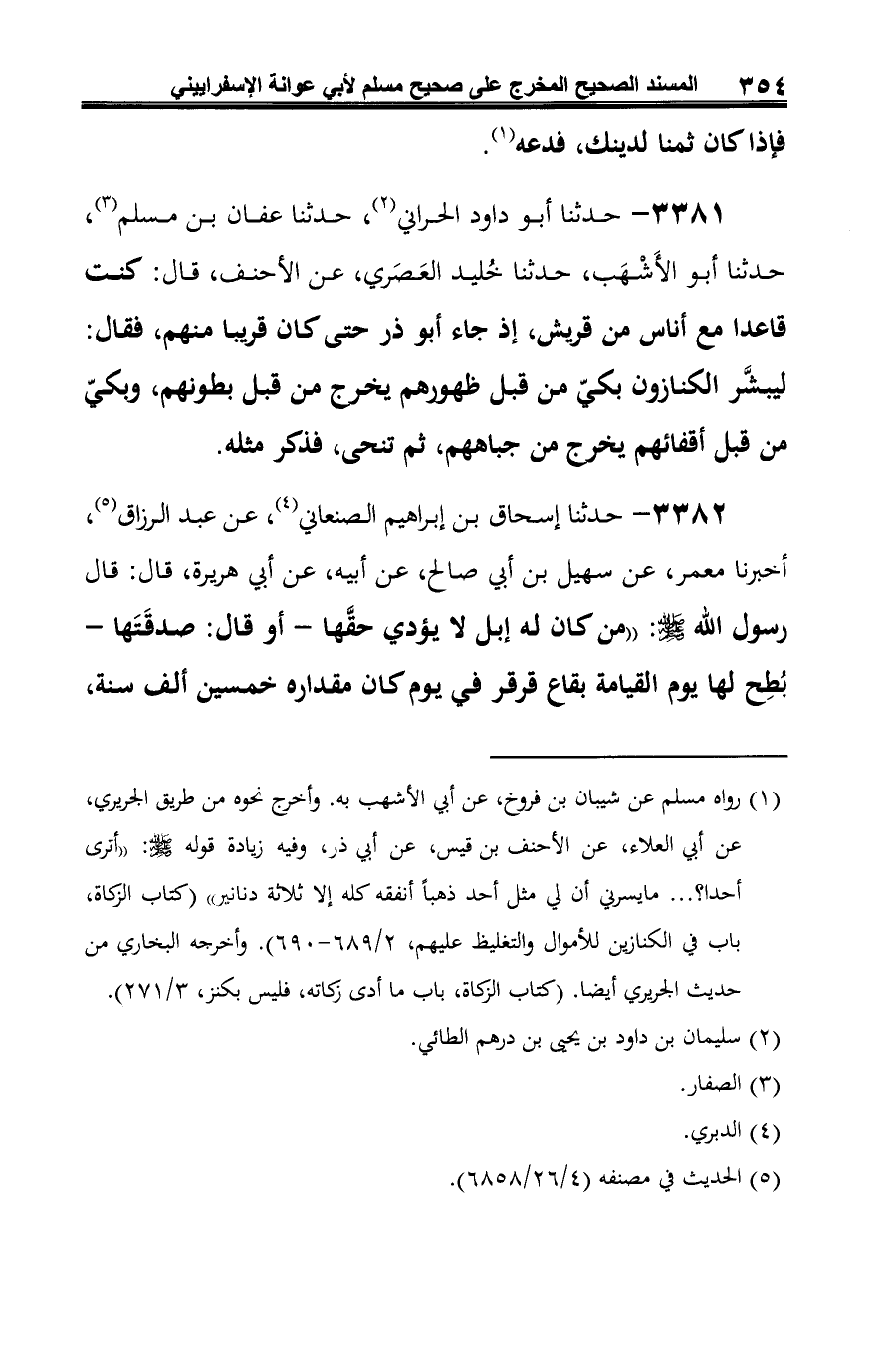 3381 - حدثنا أبو داود الحراني (¬1)، حدثنا عفان بن مسلم (¬2)، حدثنا أبو الأَشْهَب، حدثنا خُليد العَصَري، عن الأحنف، قال: كنت قاعدا مع أناس من قريش، إذ جاء أبو ذر حتى كان قريبا منهم، فقال: ليبشَّر الكنازون بكيّ من قبل ظهورهم يخرج من قبل بطونهم، وبكيّ من قبل أقفائهم يخرج من جباههم، ثم تنحى، فذكر مثله.