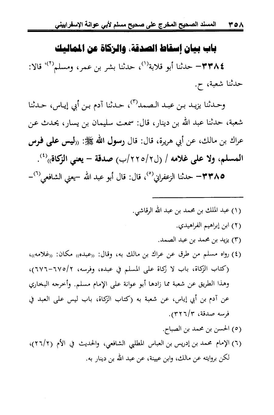 (¬4) رواه مسلم من طرق عن عراك بن مالك به، وقال: "عبده" مكان: "غلامه"، (كتاب الزكاة، باب لا زكاة على المسلم في عبده، وفرسه، 2/ 675 - 676)، وهذا الطريق عن شعبة مما زادها أبو عوانة على الإمام مسلم. وأخرجه البخاري عن آدم بن أبي إياس، عن شعبة به (كتاب الزكاة، باب ليس على العبد في فرسه صدقة، 3/ 326).