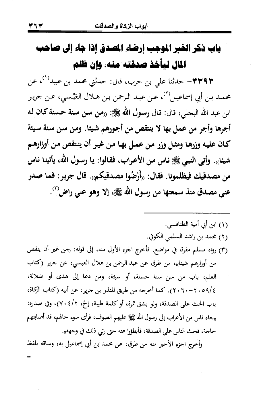 3393 - حدثنا علي بن حرب، قال: حدثني محمد بن عبيد (¬1)، عن محمد بن أبي إسماعيل (¬2)، عن عبد الرحمن بن هلال العَبْسي، عن جرير ابن عبد الله البجلي، قال: قال رسول الله -صلى الله عليه وسلم-: "من سن سنة حسنة كان له أجرها وأجر من عمل بها لا ينتقص من أجورهم شيئا. ومن سن سنة سيئة كان عليه وزرها ومثل وزر من عمل بها من غير أن ينتقص من أوزارهم شيئا". وأتى النبي -صلى الله عليه وسلم- ناس من الأعراب، فقالوا: يا رسول الله، يأتينا ناس من مصدقيك فيظلمونا. فقال: "أَرْضُوا مصدقيكم". قال جرير: فما صدر عني مصدق منذ سمعتها من رسول الله -صلى الله عليه وسلم-، إلا وهو عني راض (¬3).