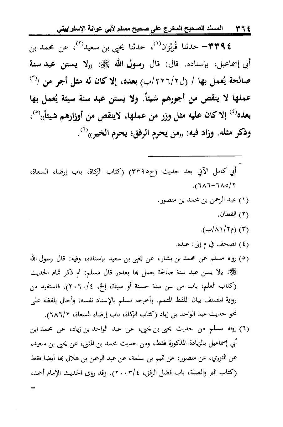 3394 - حدثنا قُربُزان (¬1)، حدثنا يحيى بن سعيد (¬2)، عن محمد بن أبي إسماعيل، بإسناده. قال: قال رسول الله -صلى الله عليه وسلم-: "لا يستن عبد سنة صالحة يُعمل بها بعده، إلا كان له مثل أجر من (¬3) عملها لا ينقص من أجورهم شيئًا. ولا يستن عبد سنة سيئة يُعمل بها بعده (¬4) إلا كان عليه مثل وزر من عملها، لا ينقص من أوزارهم شيئًا" (¬5)، وذكر مثله. وزاد فيه: "من يحرم الرفق؛ يحرم الخير" (¬6).