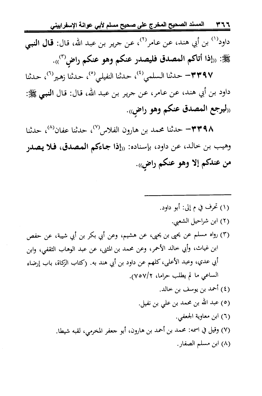 3397 - حدثنا السلمي (¬1)، حدثنا النفيلي (¬2)، حدثنا زهير (¬3)، حدثنا داود بن أبي هند، عن عامر، عن جرير بن عبد الله، قال: قال النبي -صلى الله عليه وسلم-: "ليرجع المصدق عنكم وهو راضٍ".