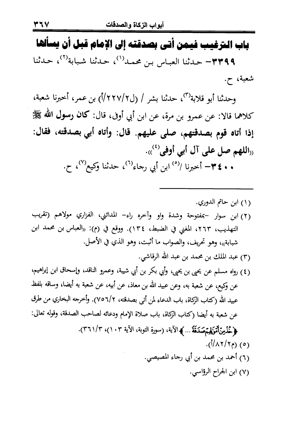 (¬4) رواه مسلم عن يحيى بن يحيى، وأبي بكر بن أبي شيبة، وعمرو الناقد، وإسحاق ابن إبراهيم، عن وكيع، عن شعبة به، وعن عبيد الله بن معاذ، عن أبيه، عن شعبة به أيضا، وساقه بلفظ عبيد الله (كتاب الزكاة، باب الدعاء لمن أتى بصدقته، 2/ 756). وأخرجه البخاري من طرق عن شعبة به أيضا (كتاب الزكاة، باب صلاة الإمام ودعائه لصاحب الصدقة، وقوله تعالى: {خُذْ مِنْ أَمْوَالِهِمْ صَدَقَةً} الآية، [التوبة: 103]، 3/ 361).
