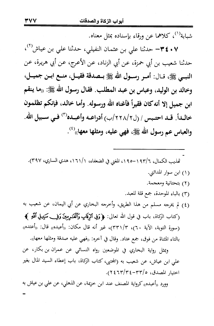 3407 - حدثنا علي بن عثمان النفيلي، حدثنا علي بن عياش (¬1)، حدثنا شعيب بن أبي حمزة، عن أبي الزناد، عن الأعرج، عن أبي هريرة، عن النبي -صلى الله عليه وسلم-، قال: أمر رسول الله -صلى الله عليه وسلم- بصدقة فقيل، منع ابن جميل، وخالد بن الوليد، وعباس بن عبد المطلب. فقال رسول الله -صلى الله عليه وسلم-: "ما ينقم ابن جميل إلا أنه كان فقيرًا فأغناه الله ورسوله. وأما خالد، فإنكم تظلمون خالدًا. قد احتبس أدراعه وأعبده (¬2) في سبيل الله.