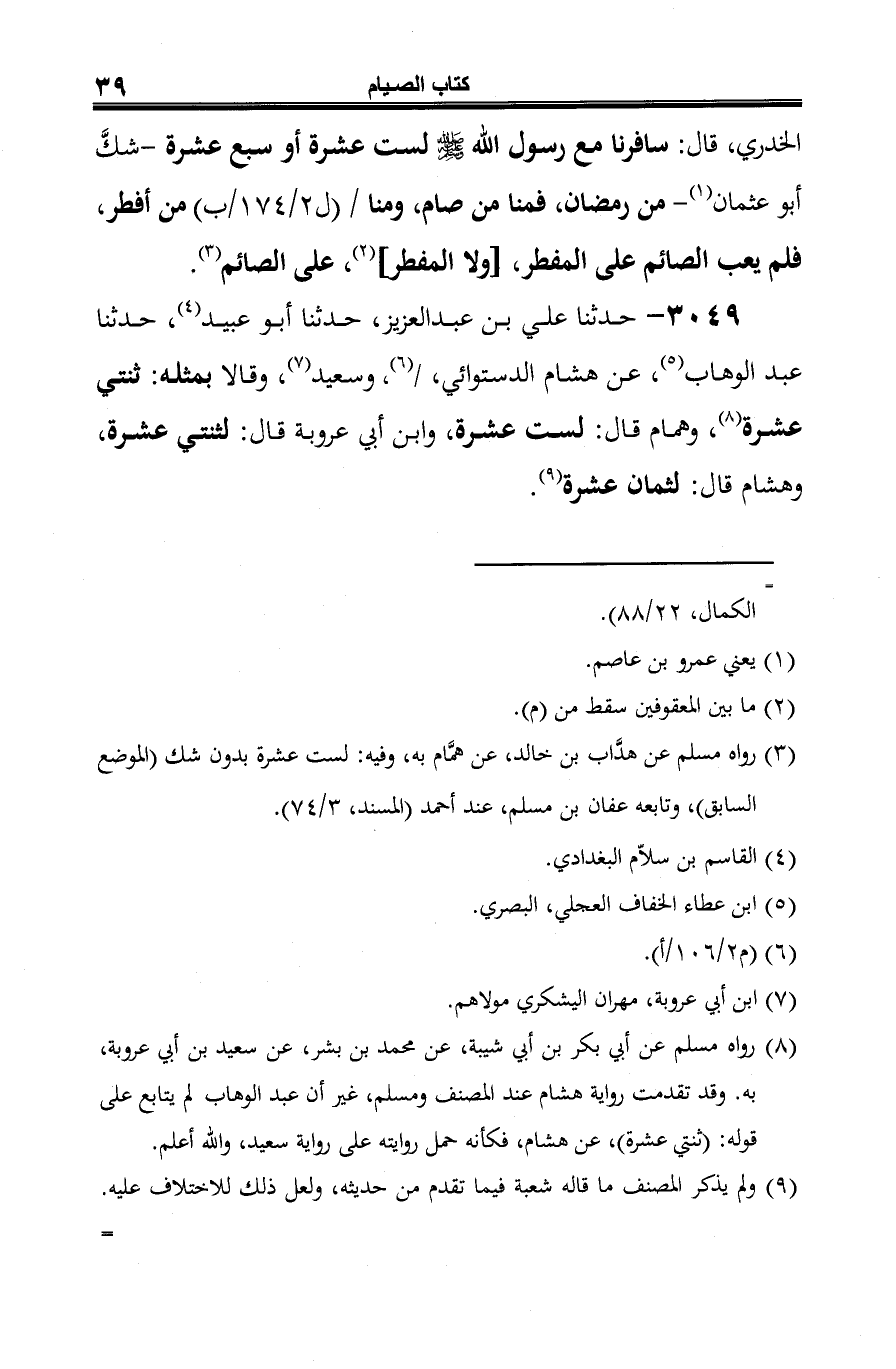 3049 - حدثنا علي بن عبد العزيز، حدثنا أبو عبيد (¬1)، حدثنا عبد الوهاب (¬2)، عن هشام الدستوائي، (¬3)، وسعيد (¬4)، وقالا بمثله: ثنتي عشرة (¬5)، وهمام قال: لست عشرة، وابن أبي عروبة قال: لثنتي عشرة، وهشام قال: لثمان عشرة (¬6).