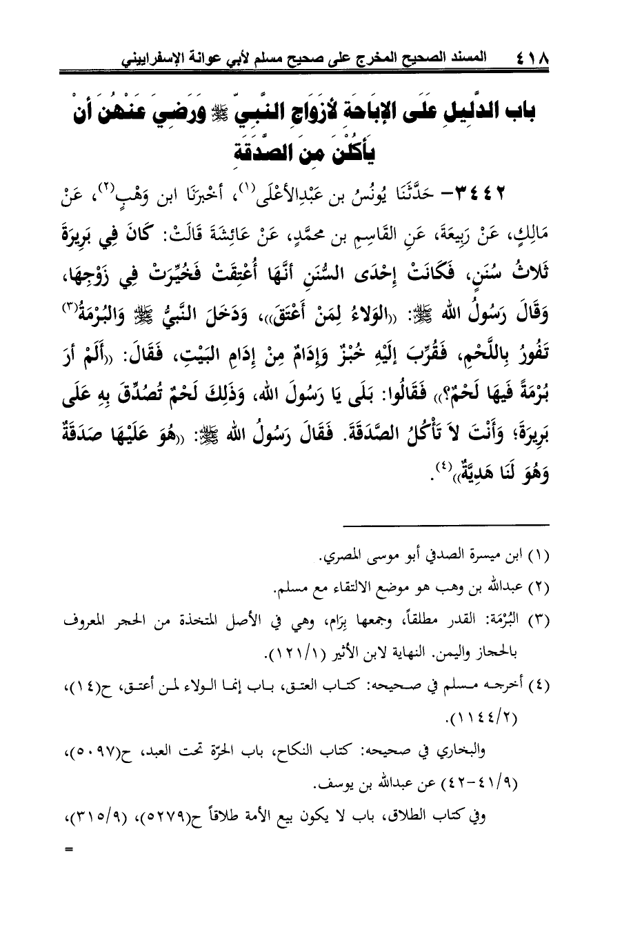 (¬8) أخرجه مسلم في صحيحه: كتاب الزكاة، باب إباحة الهدية للنبيّ -صلى الله عليه وسلم- ولبني هاشم وبني المطلب ... ، ح (171)، (2/ 755).