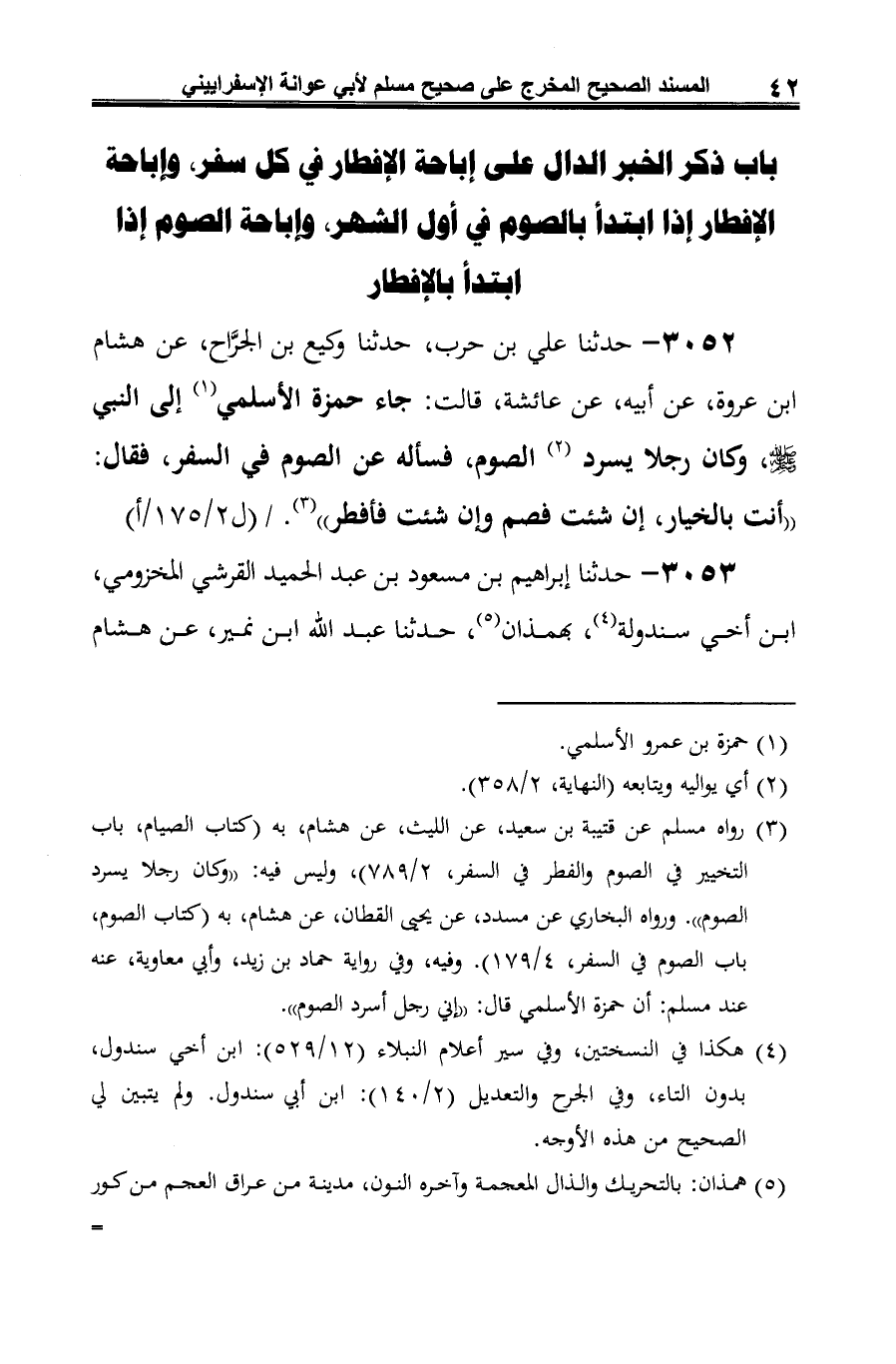 (¬3) رواه مسلم عن قتيبة بن سعيد، عن الليث، عن هشام، به (كتاب الصيام، باب التخيير في الصوم والفطر في السفر، 2/ 789)، وليس فيه: "وكان رجلا يسرد الصوم". ورواه البخاري عن مسدد، عن يحيى القطان، عن هشام، به (كتاب الصوم، باب الصوم في السفر، 4/ 179). وفيه، وفي رواية حماد بن زيد، وأبي معاوية، عنه عند مسلم: أن حمزة الأسلمي قال: "إني رجل أسرد الصوم".
