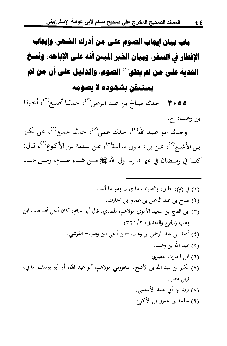 (¬10) رواه مسلم عن عمرو بن سواد العامري، عن ابن وهب، به (كتاب الصيام، باب بيان نسخ قوله تعالى: {وَعَلَى الَّذِينَ يُطِيقُونَهُ فِدْيَةٌ. . .} (سورة البقرة: الآية 184) بقوله: {فَمَنْ شَهِدَ مِنْكُمُ الشَّهْرَ فَلْيَصُمْهُ} (سورة البقرة: الآية 185)، (2/ 802).