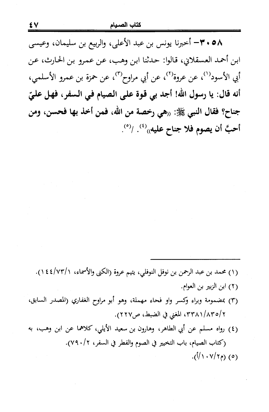 3058 - أخبرنا يونس بن عبد الأعلى، والربيع بن سليمان، وعيسى ابن أحمد العسقلاني، قالوا: حدثنا ابن وهب، عن عمرو بن الحارث، عن أبي الأسود (¬1)، عن عروة (¬2)، عن أبي مراوح (¬3)، عن حمزة بن عمرو الأسلمي، أنه قال: يا رسول الله! أجد بي قوة على الصيام في السفر، فهل عليّ جناح؟ فقال النبي -صلى الله عليه وسلم-: "هي رخصة من الله، فمن أخذ بها فحسن، ومن أحبَّ أن يصوم فلا جناح عليه" (¬4). (¬5).